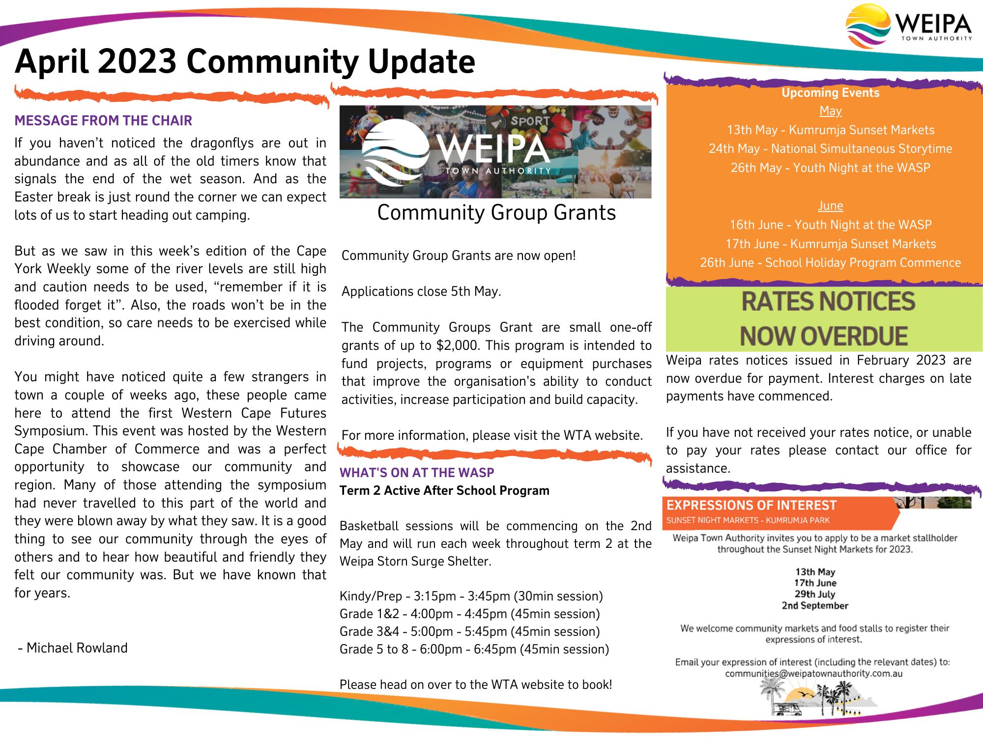 Tuesday, April 25, 2023 – Cape York Weekly – Page 3 WEIPA What’s on at... BOWLIES WEIPA BOWLS CLUB INC. Your club, our community! Members, guests & bona fide visitors welcome EMAIL: admin@weipabowlsclub.com.au 1 ARTIE WALES DRIVE WEIPA QLD 4874 PH: 07 4214 6500 THE BOTTLESHOP OPEN 10AM – 9PM 7 DAYS Come on in... • Air conditioned • Big screens GAMBLE RESPONSIBLY WEIPA VMR RAFFLES 5 to 7pm every Friday • Great prizes! • Come and support our local volunteers $15 includes lunch Names in by 8.30am for a 9am start SUNDAY SOCIAL BOWLS EVERY SUNDAY! WEATHER PERMITTING R eservationsph:4214 6503 Takeawayph:4214651 0 RESTAURANT CLOSED MONDAY & TUESDAY OPEN: Wednesday to Sunday Noon – 2pm then 5 – 8pm RESERVATIONS ESSENTIAL Guaranteed $250 giveaway on re-draws unless there's a jackpot winner! Member must be present & have swiped card @ kiosk MEMBER GIVEAWAY EVERY FRIDAY NIGHT NEW FORMAT This week's 1st draw: $1,250 EVERY WEDNESDAY NIGHT! 2 draws – 1st draw @ 6:30pm Members must be present to win CURRENT JACKPOT $12,000 BAR & GAMING STAFF REQUIRED Contact the Club for more details SEE AD ON PAGE 16 General Cargo • Project & Charter • Mothershipping • Defence • Fuel • Engineering • Adventure Cruises Sea Swift is proud to support remote communities across the Torres Strait and Cape York through sponsorship opportunities, with our contributions valued at more than $1 million per year. Proudly supporting your community for more than 35 years seaswift.com.au 1800 424 422 This support includes: • Arts and cultural events • Environmental conservation • Community wellbeing • Local enterprise • Community events. Check our website for the latest news and updates for your community.