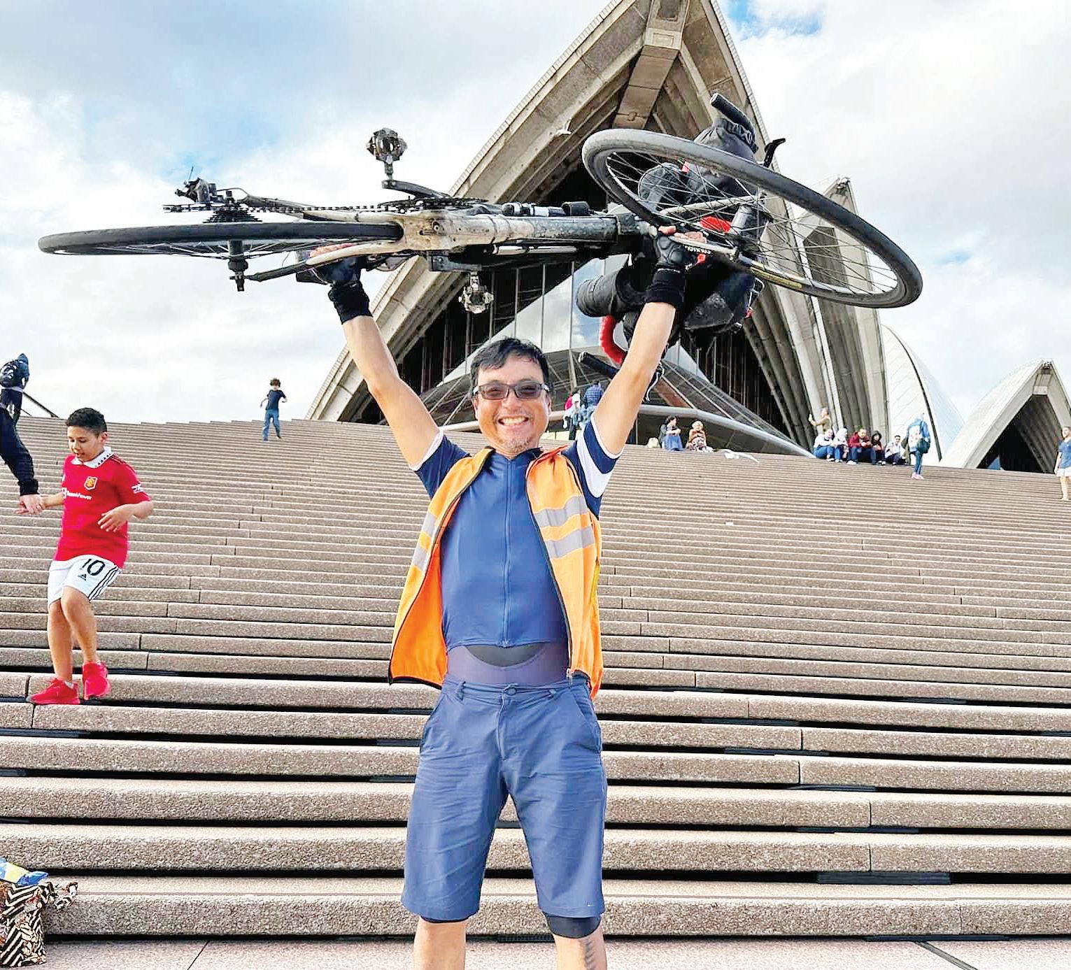 Dale Tan celebrates his achievement on the steps of the Sydney Opera House.