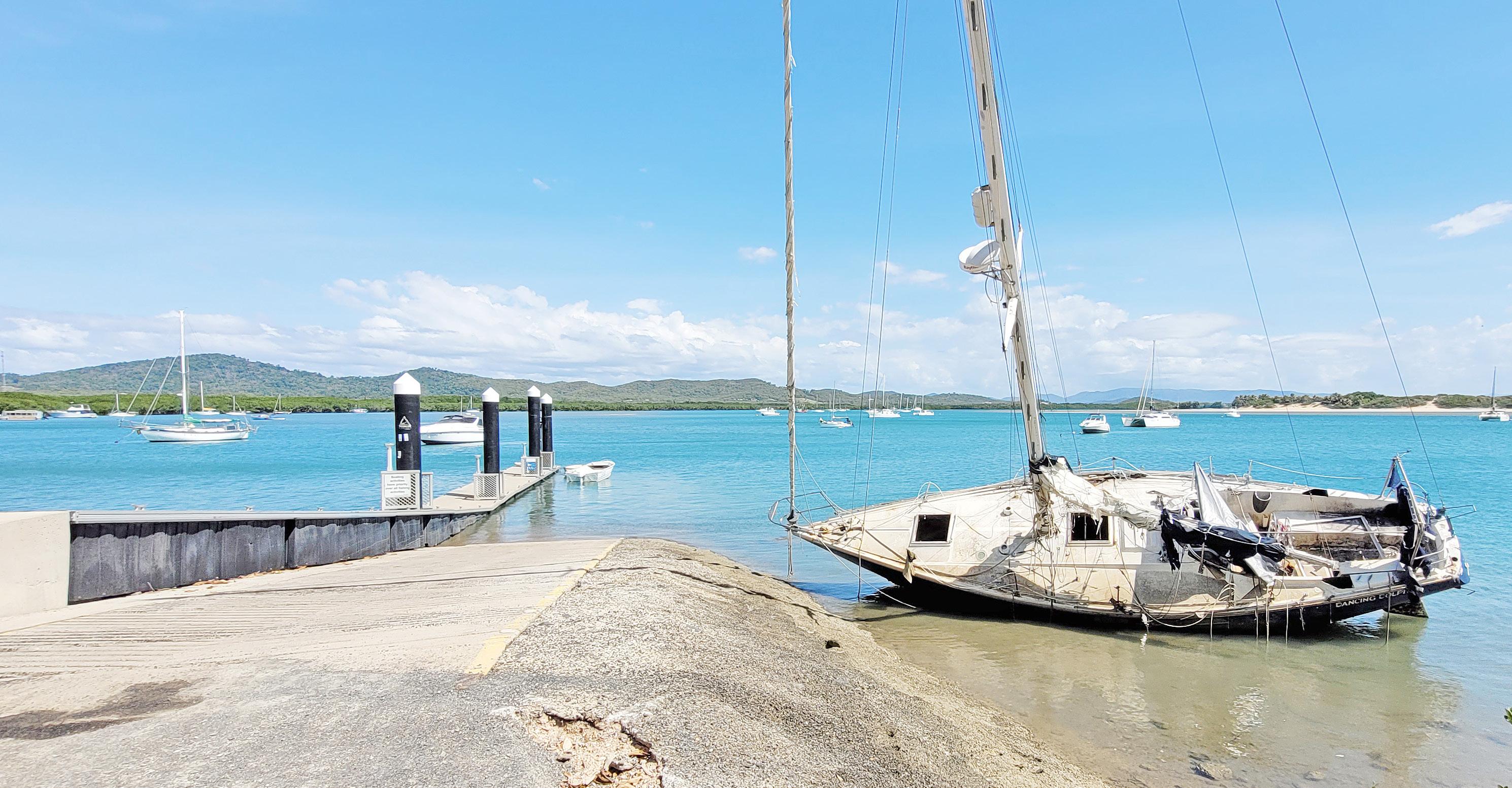 The Cooktown Coast Guard dragged the crippled yacht to shallow water in the Endeavour River – next to the public boat ramp – where it has remained since for all to see.