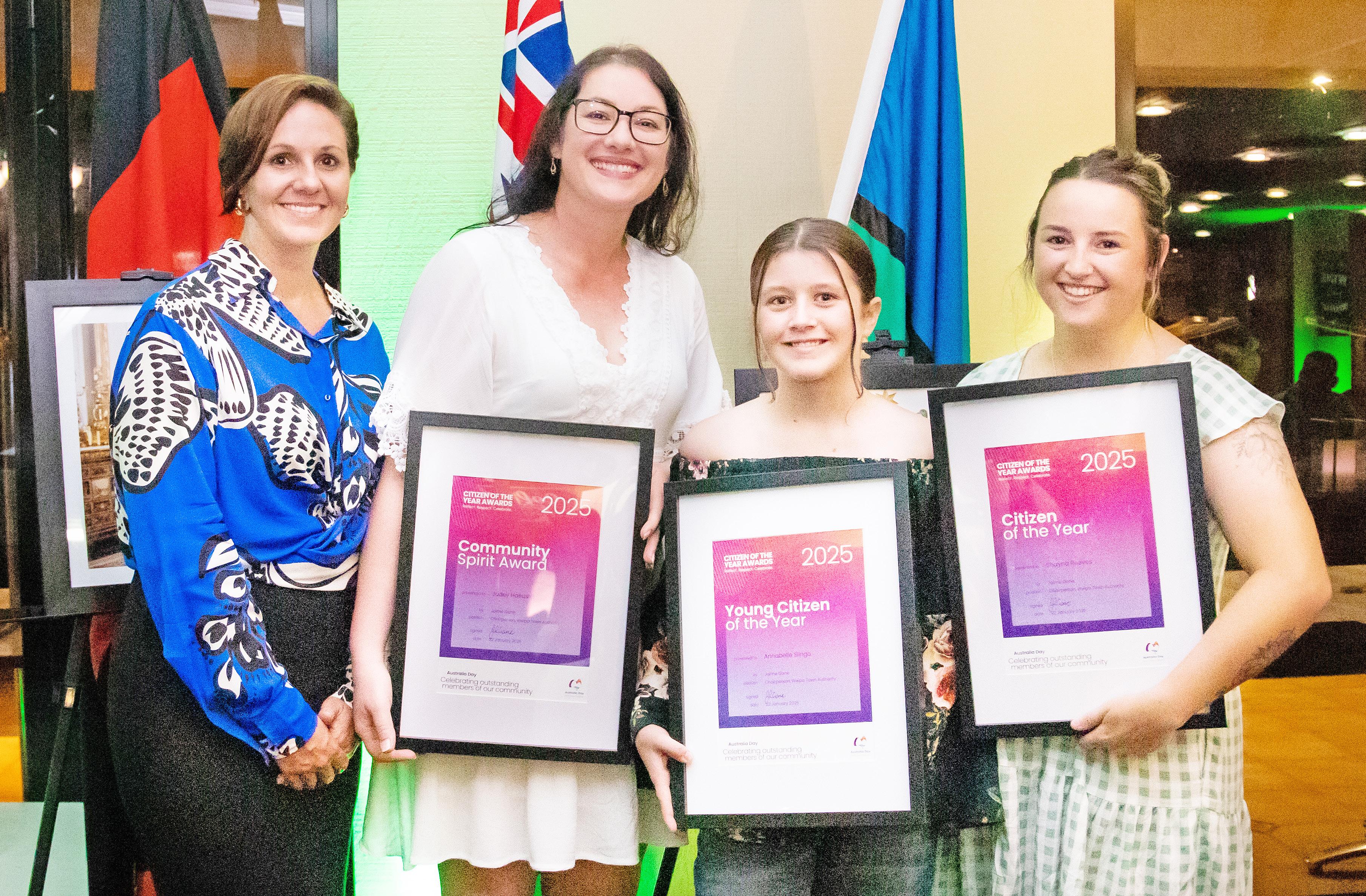 Weipa Town Authority Chair Jaime Gane congratulates Community Spirit Award winner Judey Haeusler, Young Citizen of the Year Annabelle Slingo and Citizen of the Year Shayna Reeves. Check out who else was recognised for their contributions as part of our special Australia Day coverage on Pages 10-12.
