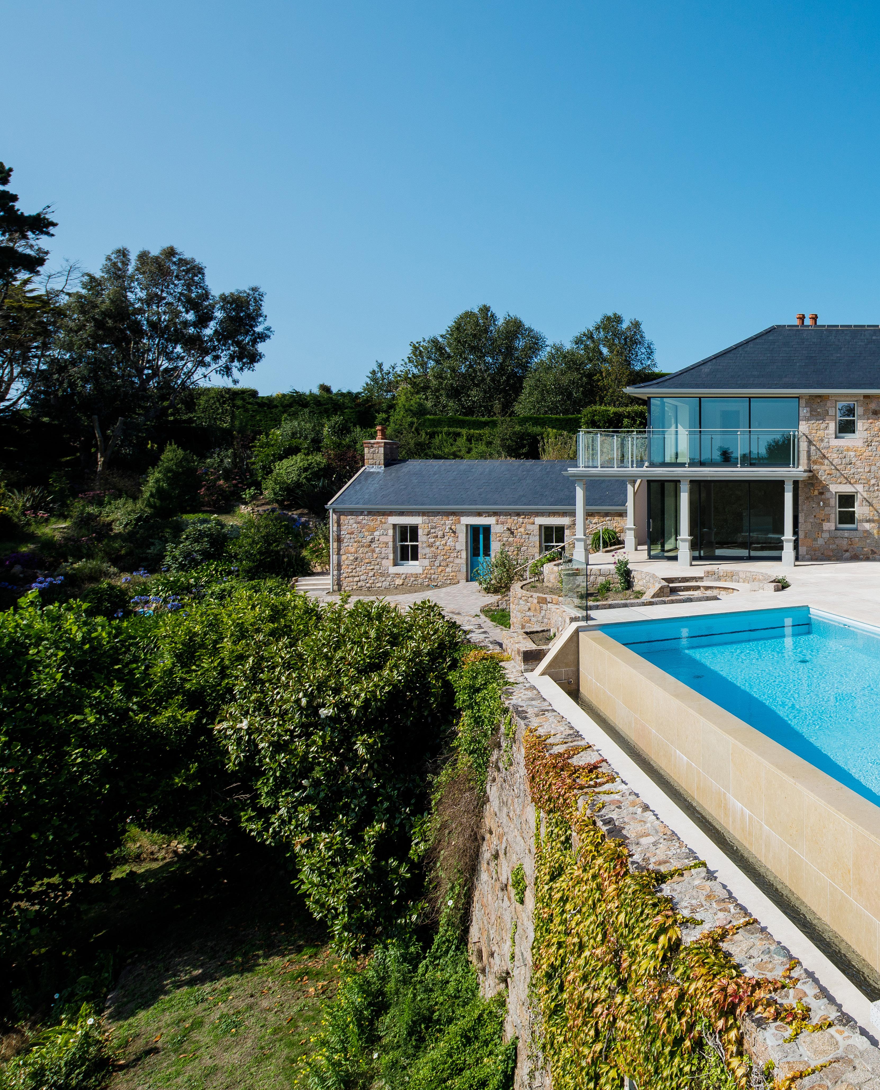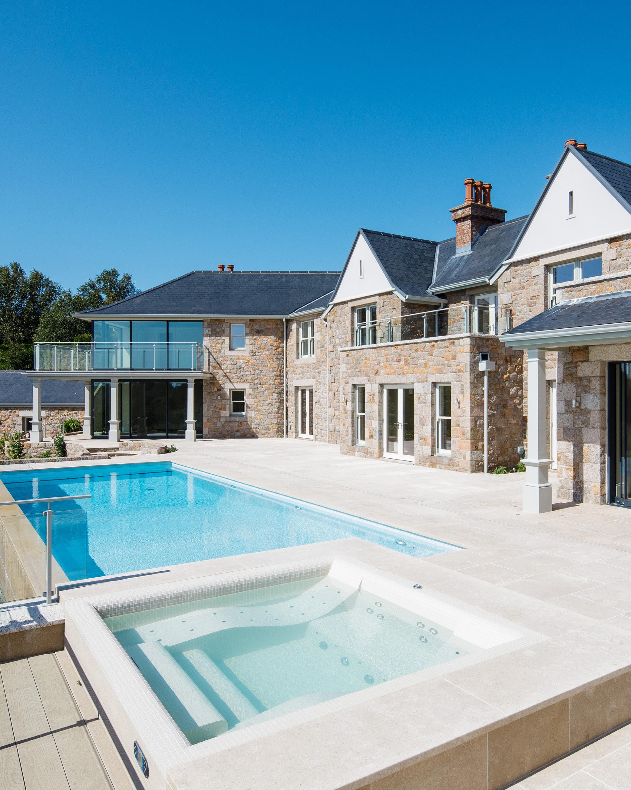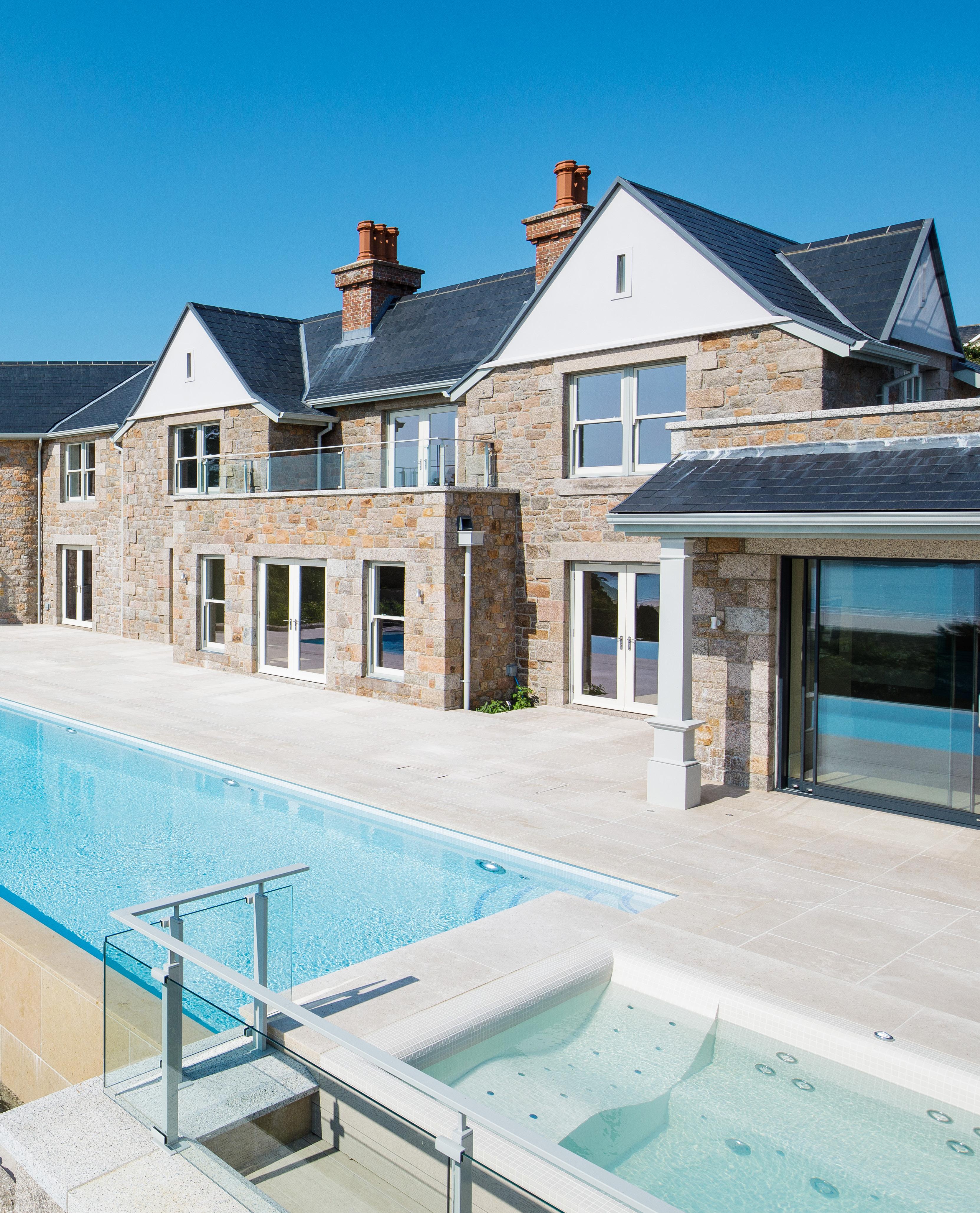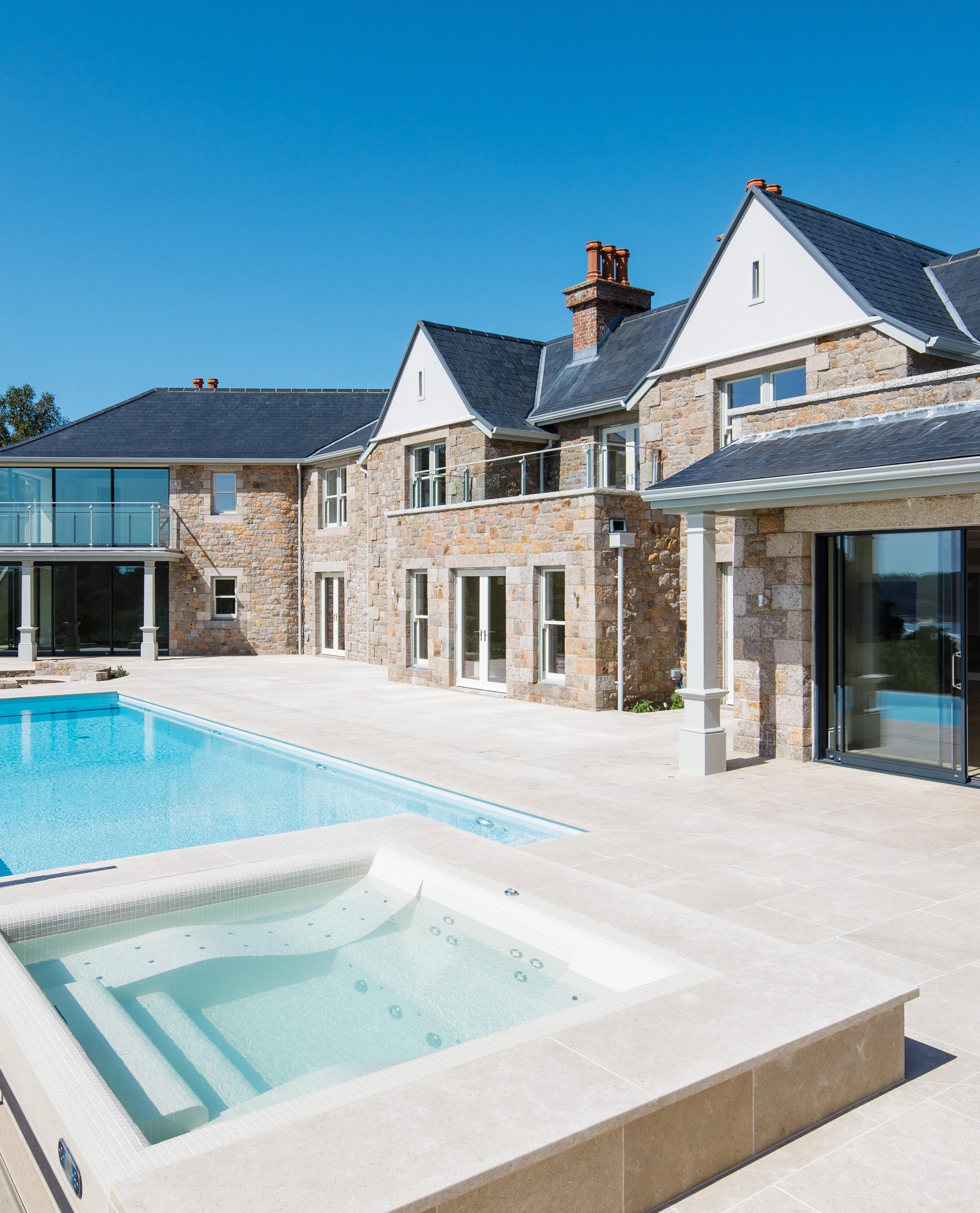 A spectacular property on the picturesque island of Jersey, this extensive family home sits proudly in the blue waters of the British Isles. Its beautifully landscaped exterior comprises a terrace and pool area clad with Wychwood limestone in a tumbled & etched finish.