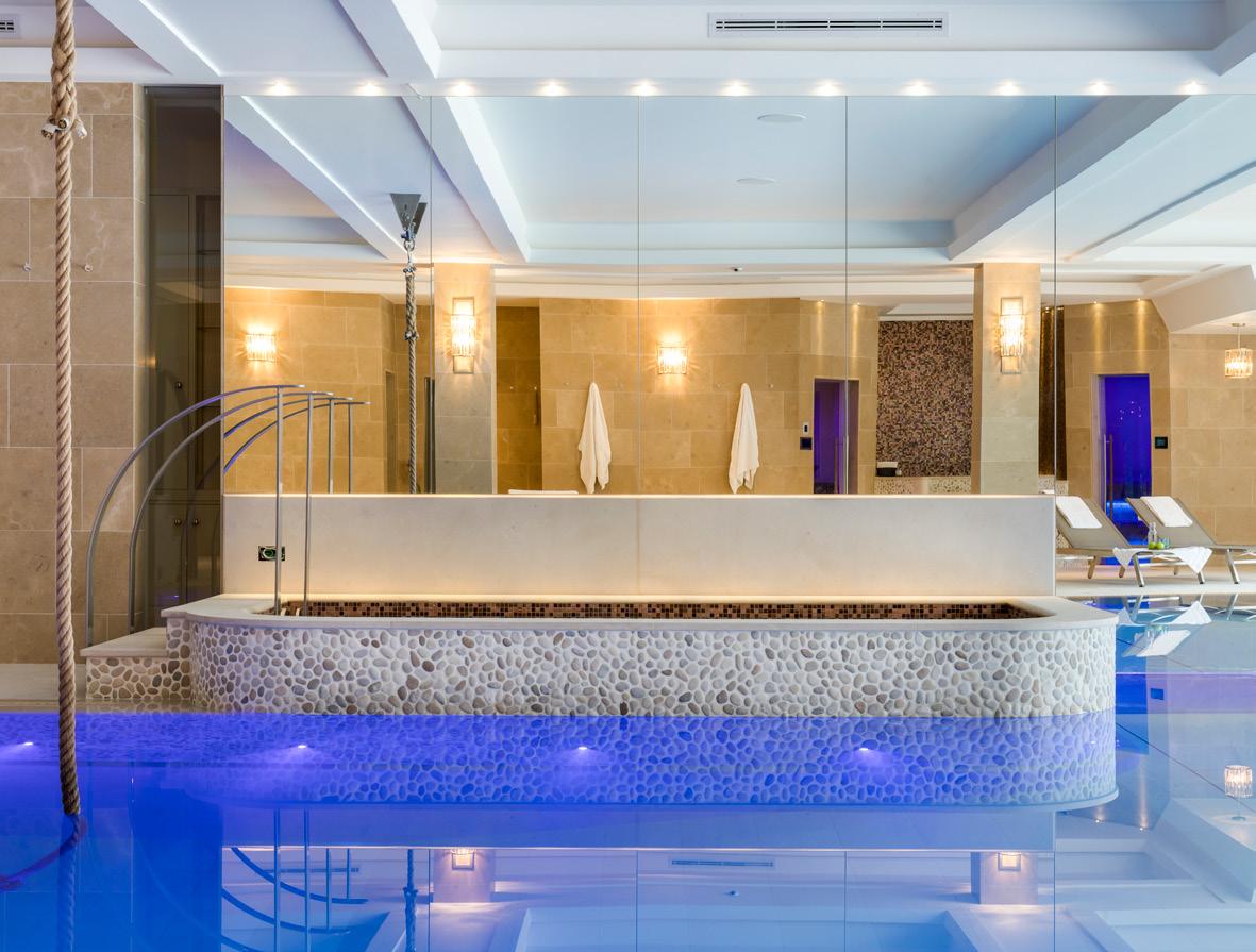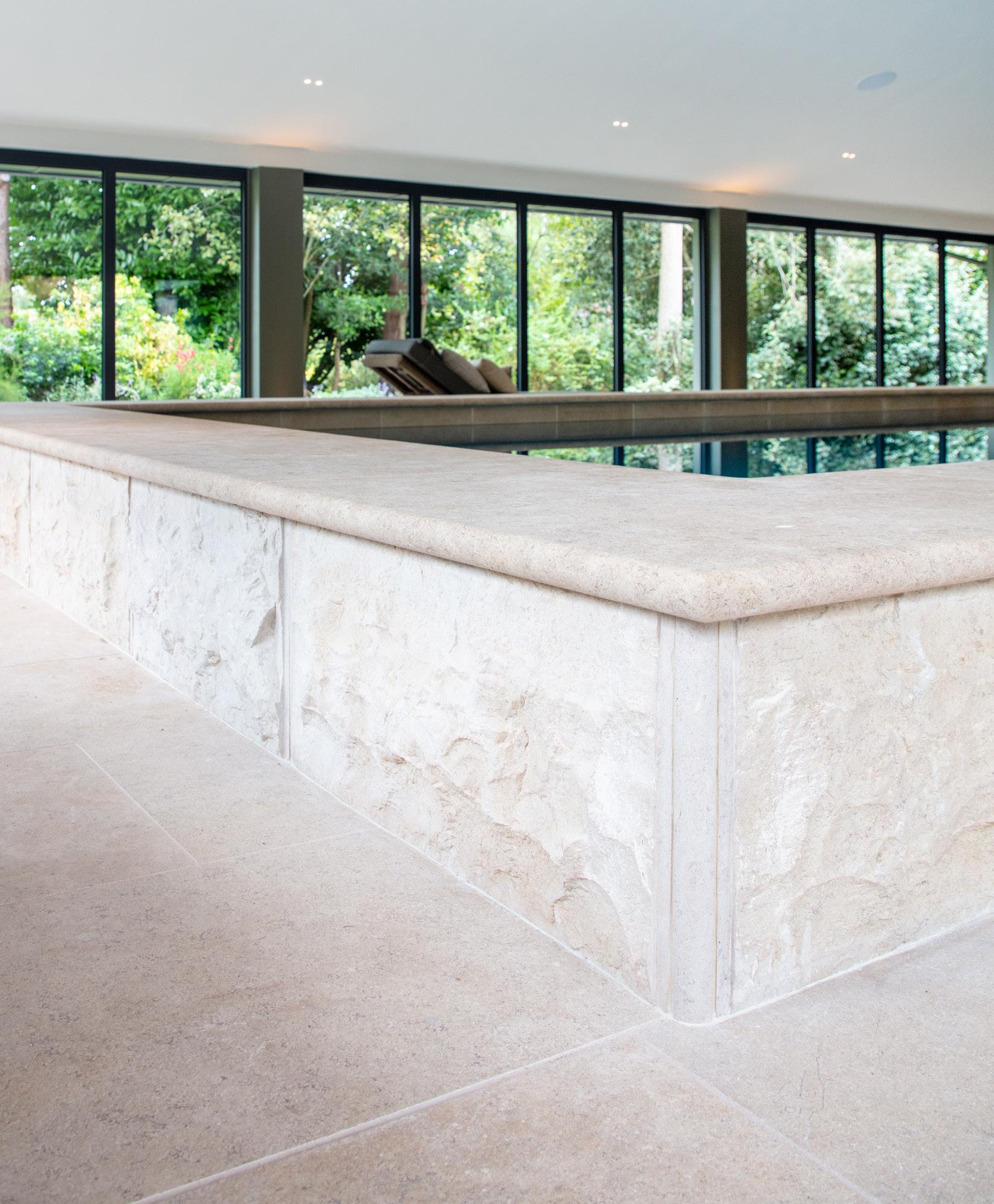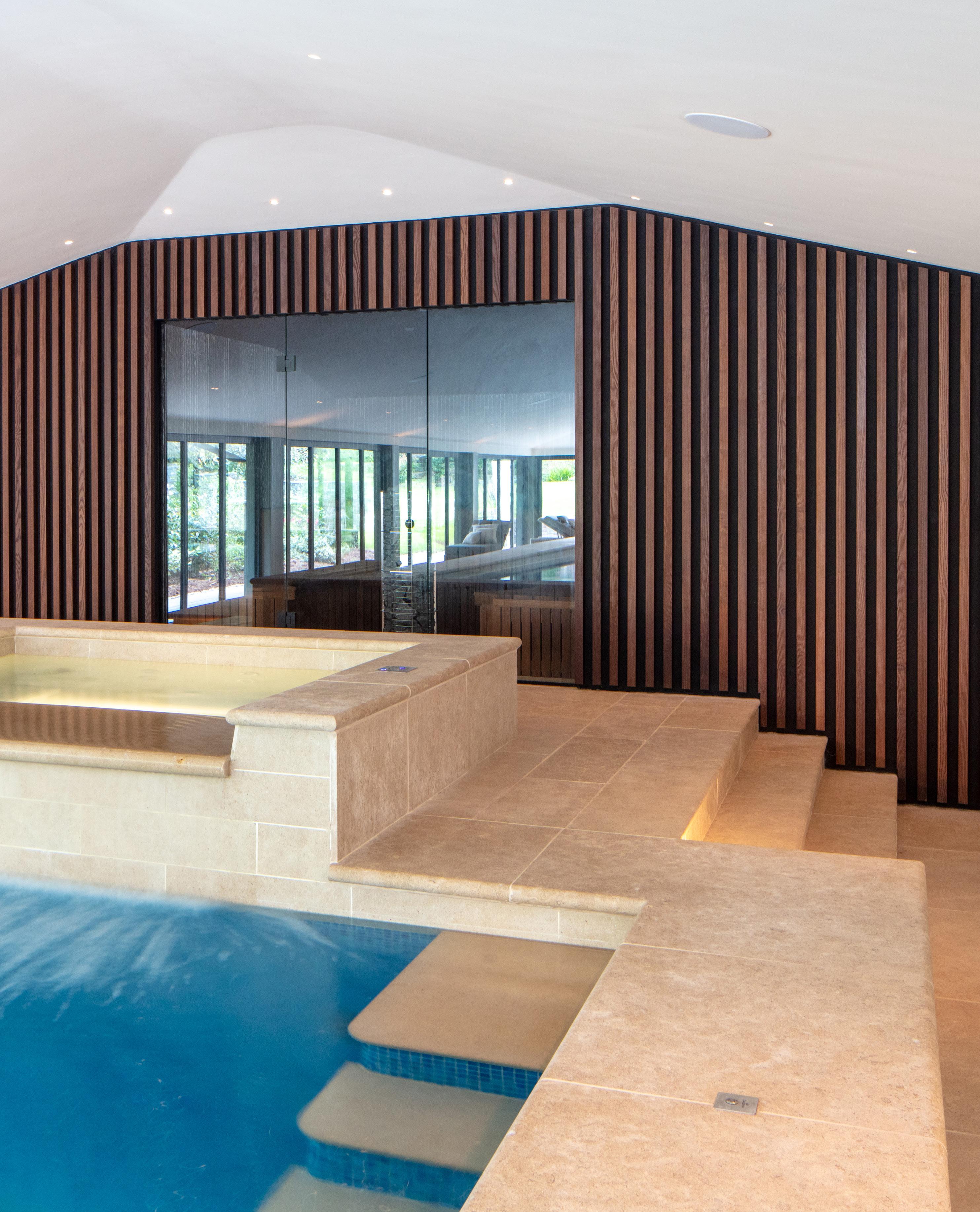 A selection of natural, bespoke stone was used within this impressive pool and spa installation, including Wychwood limestone for the pool, changing rooms and WC areas and Trusloe limestone cladding within the sauna.