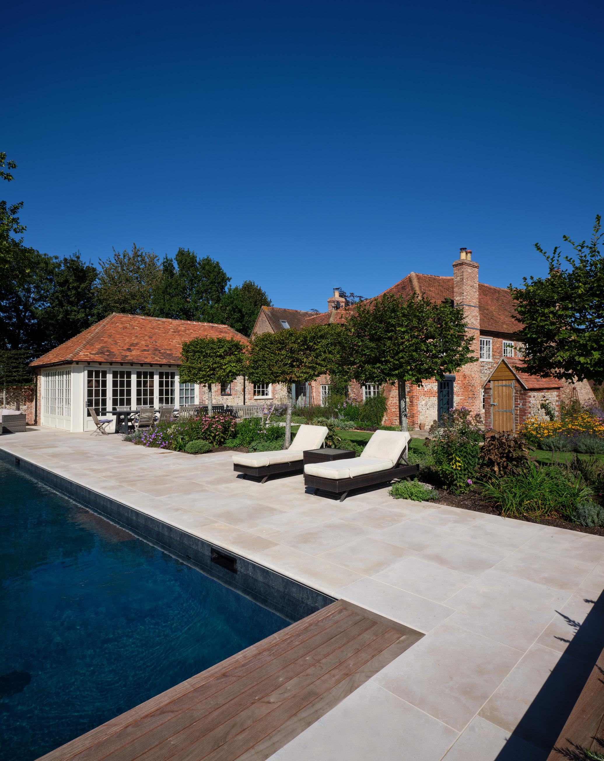 Our Buscot limestone in a tumbled and etched finish was chosen throughout for its soft, honeyed tones and subtle texture. Used for the pool surround, coping stones, terraces, steps and even the floor of the pool house, the stone creates a cohesive backdrop that reflects light and enhances the aquamarine tones of the pool.