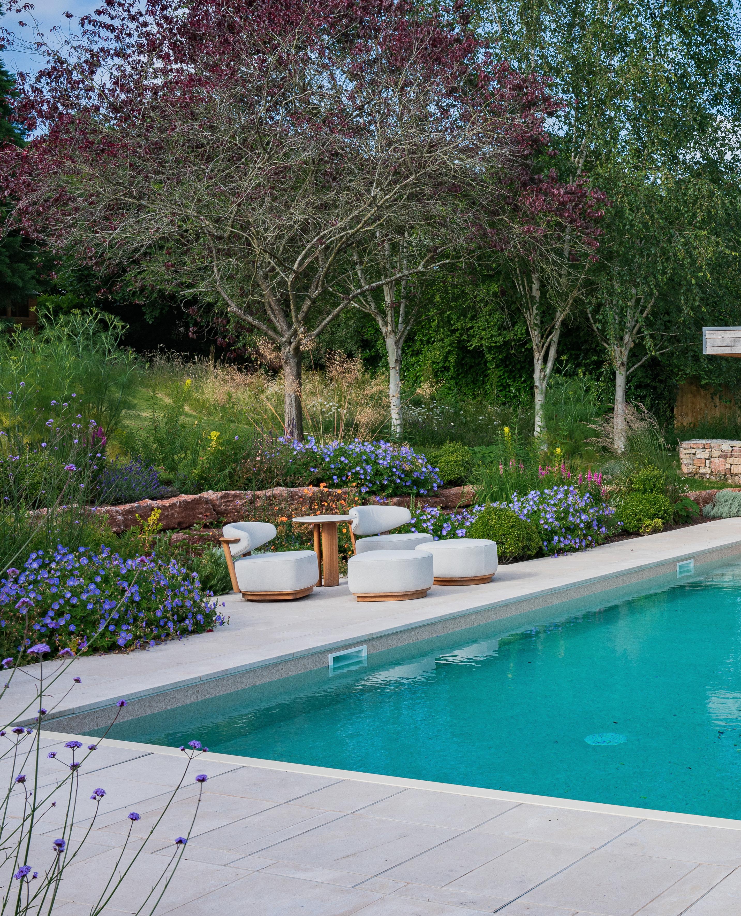 Set within a sloping garden at the foot of the Mendip Hills in North Somerset, this project by Artisan Landscapes centred on the creation of a swimming pool and cantilevered pool house as the main features of the design. The challenge was to connect the new pool terrace - set higher than the cottage - with the house and existing mature garden, creating a sense of flow and journey through the space. The site of a former pond provided a natural location for the pool, while a redundant summerhouse gave way to the pool house, which now accommodates a kitchen, dining area and sunken seating. Additional terraces and pathways were introduced to link the house with the pool and to create moments of relaxation and reflection along the way.
