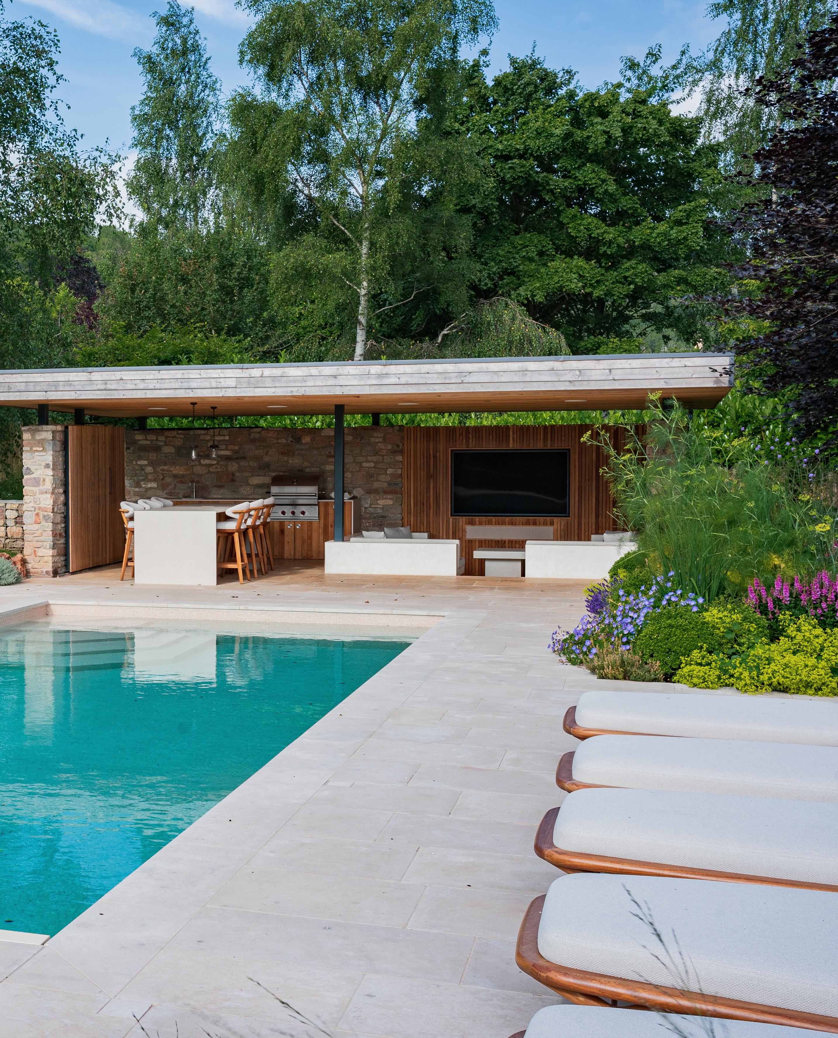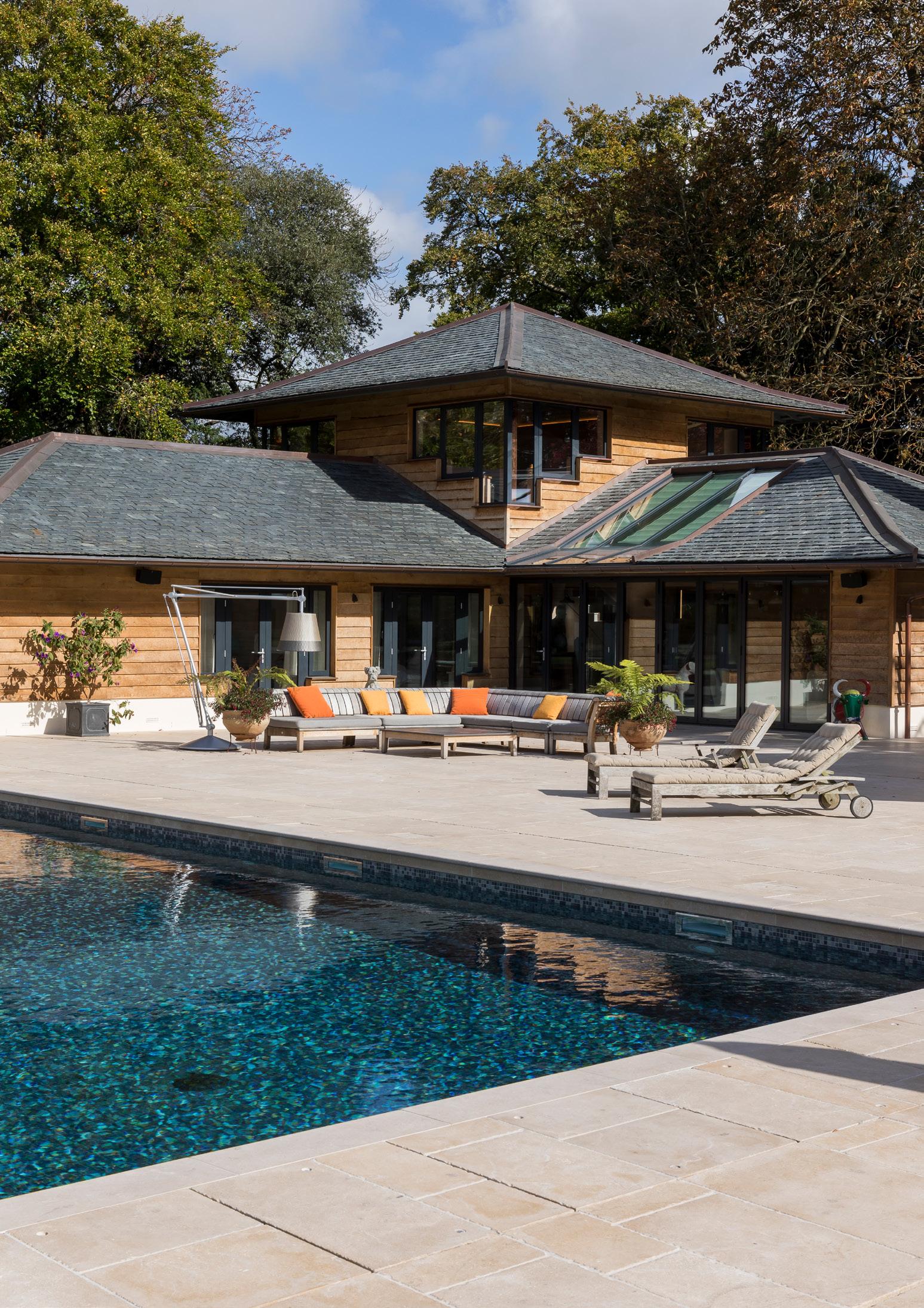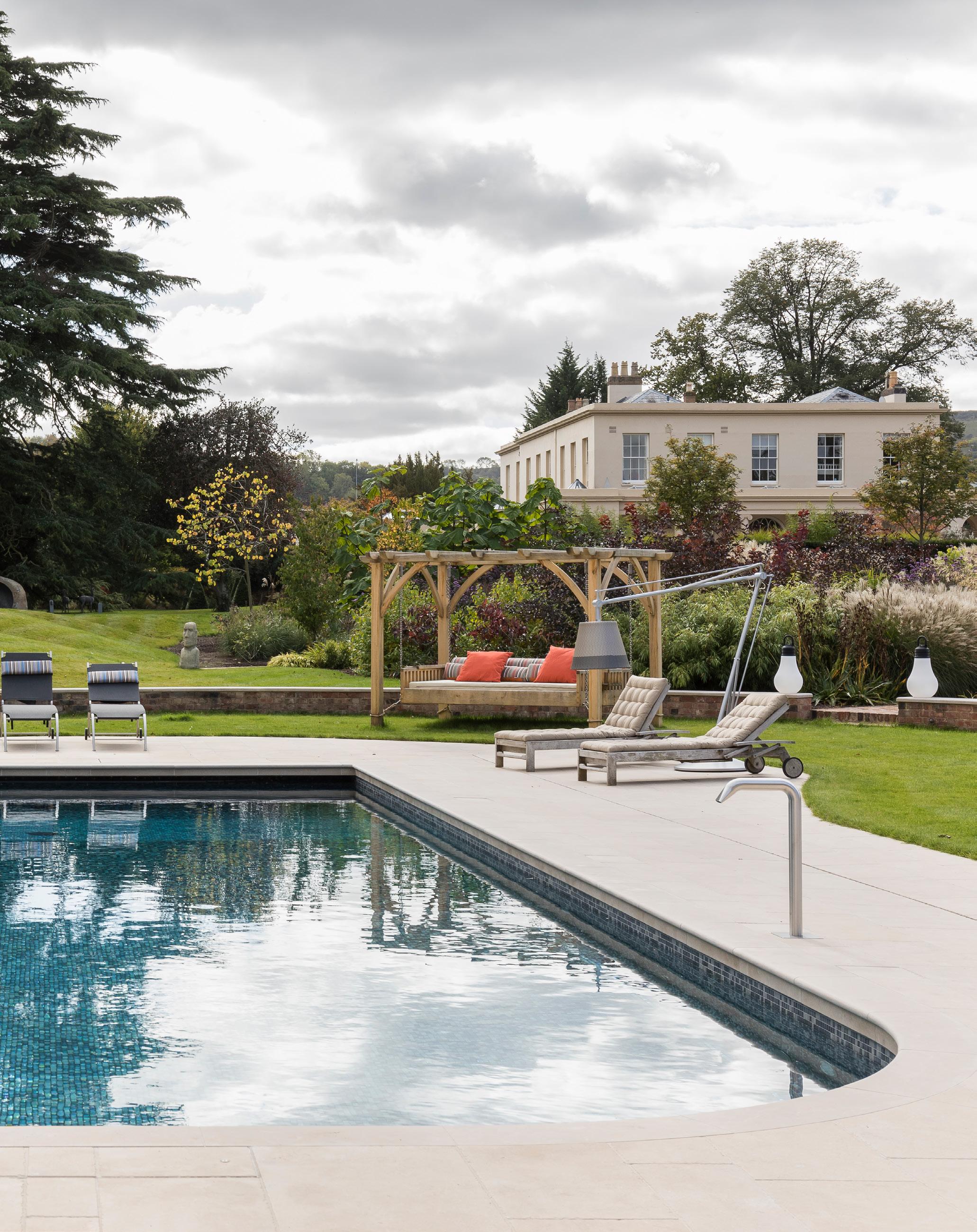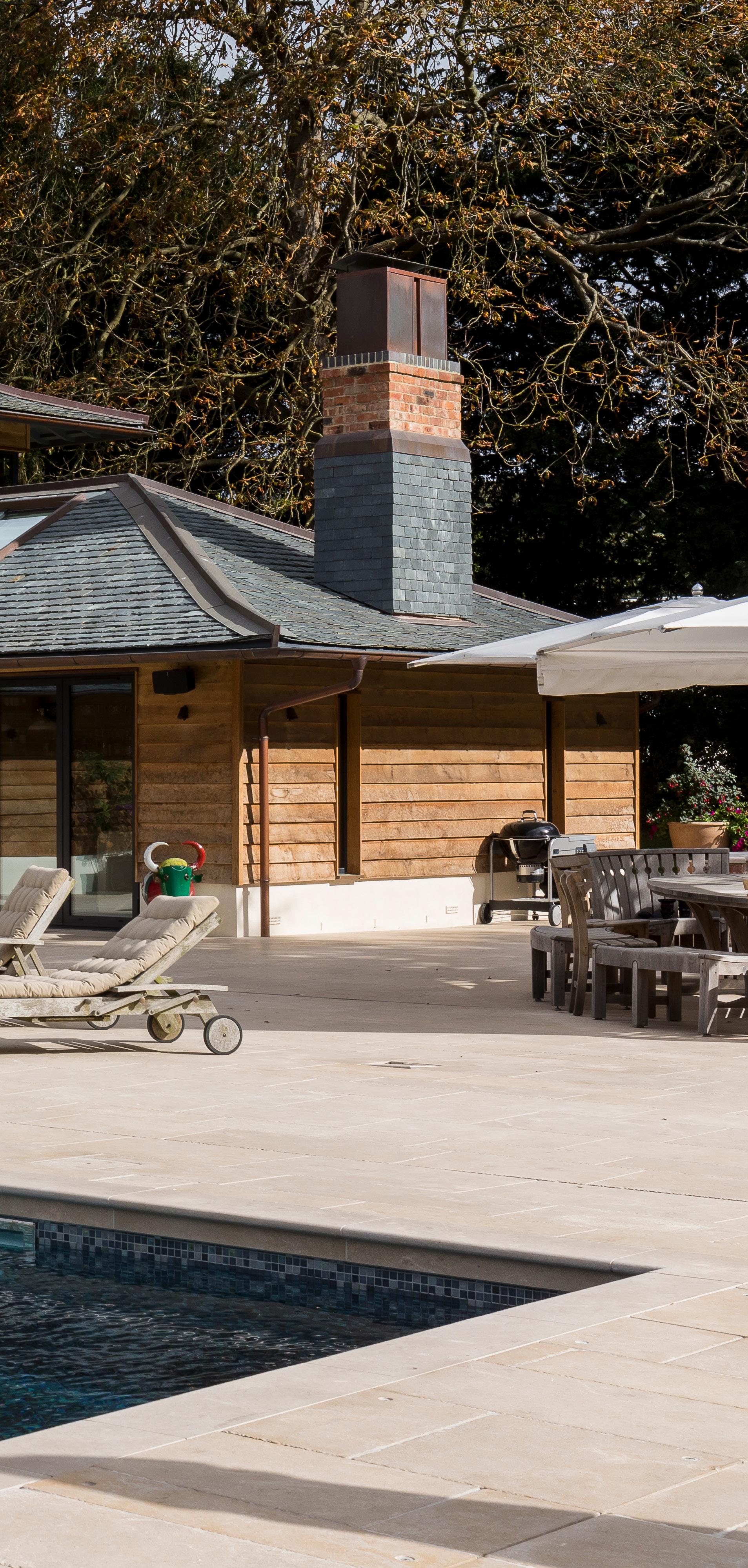 Towards the rear of the house lies the swimming pool, barbecue and bar area, which have been given a cool, contemporary look with our Buscot limestone in an etched finish . As well as designing the pool surround and pathways, David has also beautifully landscaped the entire garden with carefully selected flowers and shrubs to complement the traditional charm of this characterful home.