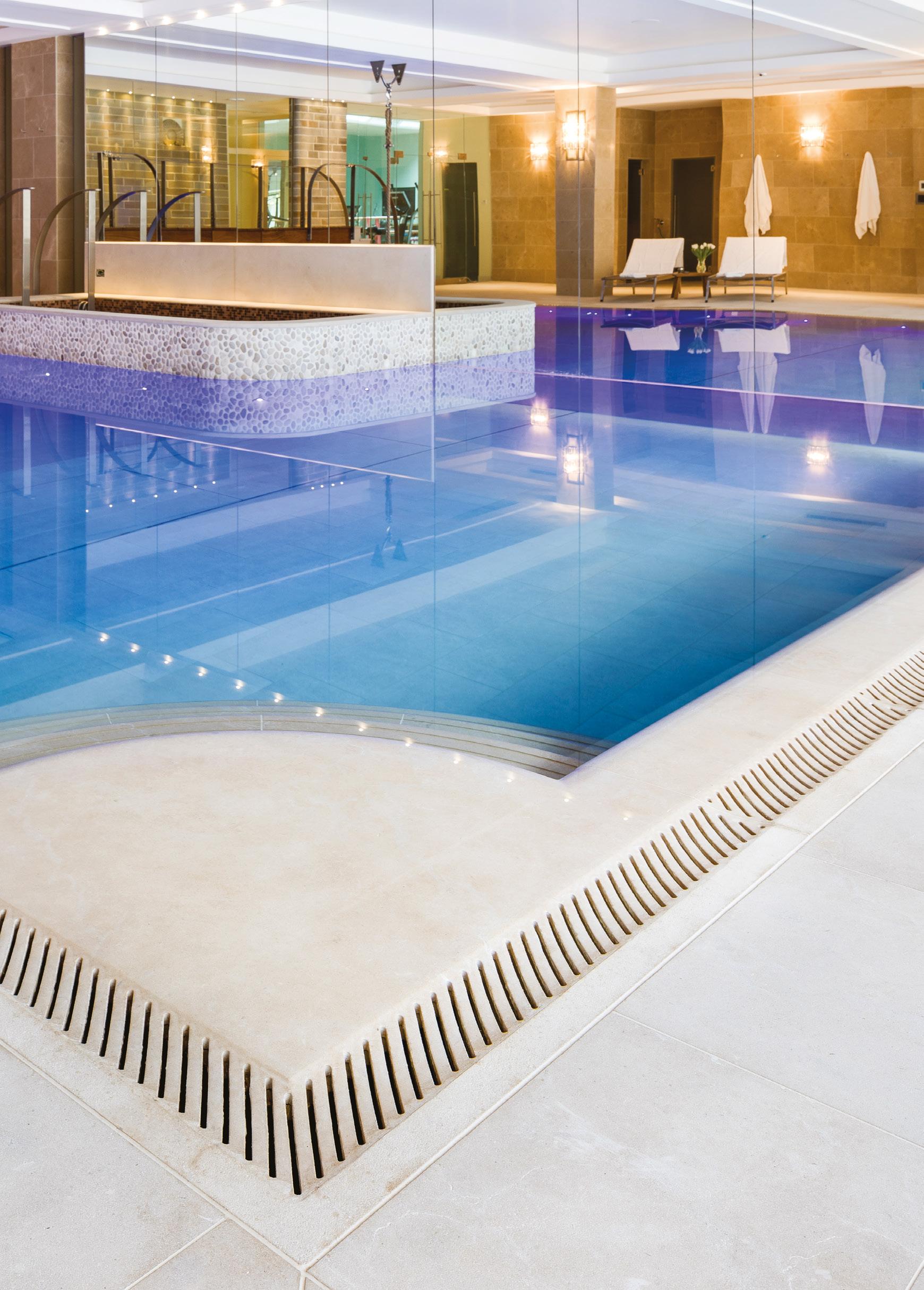 Neutral porcelain was chosen for the pool lining was provided for the pool lining, as our client wanted a contemporary finish, while for extra grip around the pool and spa tub, we supplied Buscot etched stone tiles and grilles. The pool walls and columns are Buscot limestone in a honed finish, which replicates that spa, polished look. We also supplied Buscot honed for the shower and changing room walls and floors. The limestone’s neutral colour palette and smooth finish completes the desired spa design the client wanted to achieve.