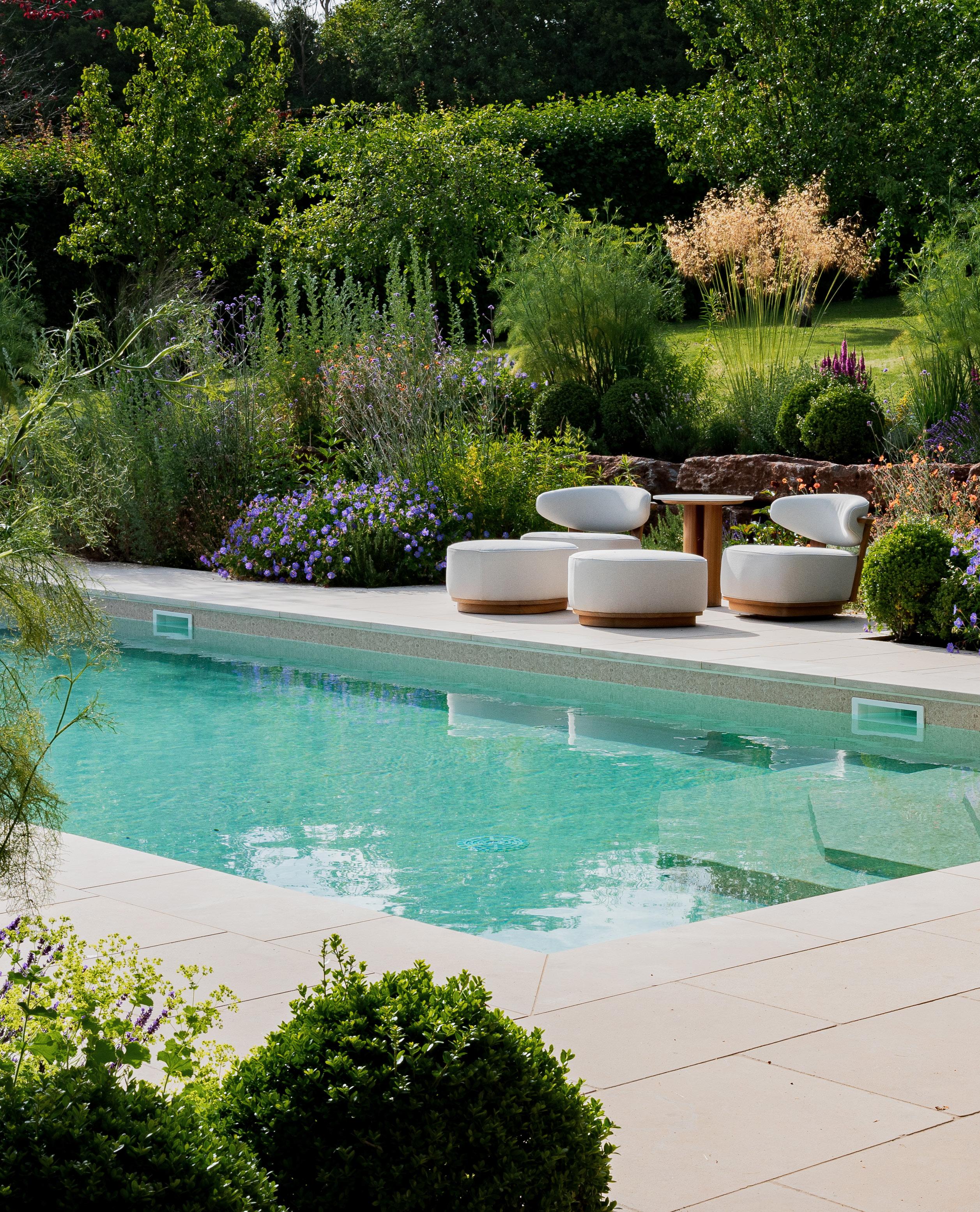 Stuart lined the swimming pool with stone, too, and also used it on the sides of the pool. He chose Grafton limestone in a seasoned finish. ‘It’s a beautiful soft grey and is a little more contemporary. The whole garden is what I would call contemporary natural so the pool has got elements of contemporary.
