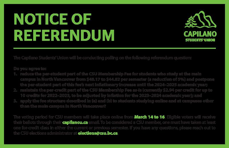 THE CAPILANO COURIER is an autonomous, democratically-run student newspaper. Literary and visual submissions are welcomed. All submissions are subject to editing for brevity, taste and legality. The Capilano Courier will not publish material deemed by the collective to exhibit sexism, racism or homophobia. The views expressed by the contributing writers are not necessarily those of the Capilano Courier publishing society.
