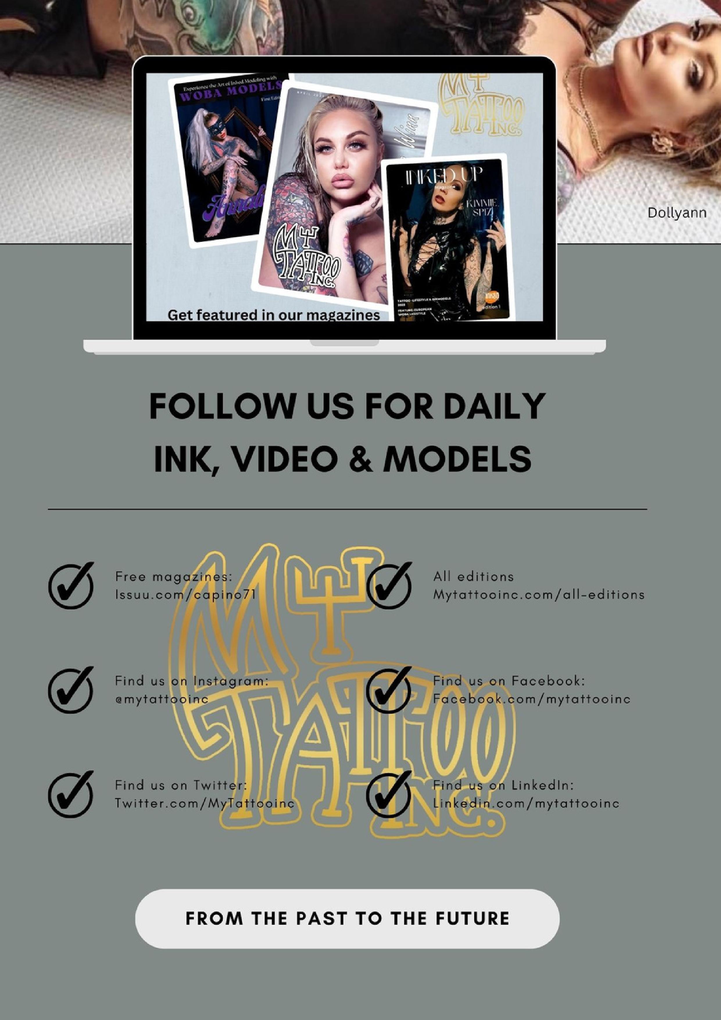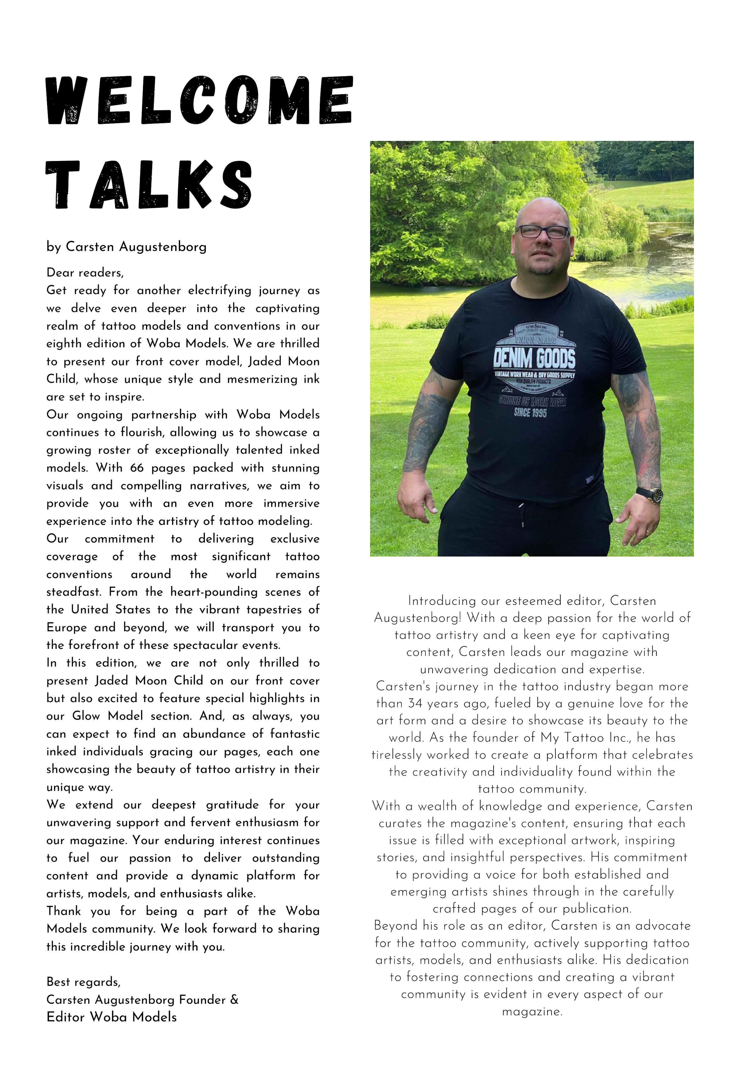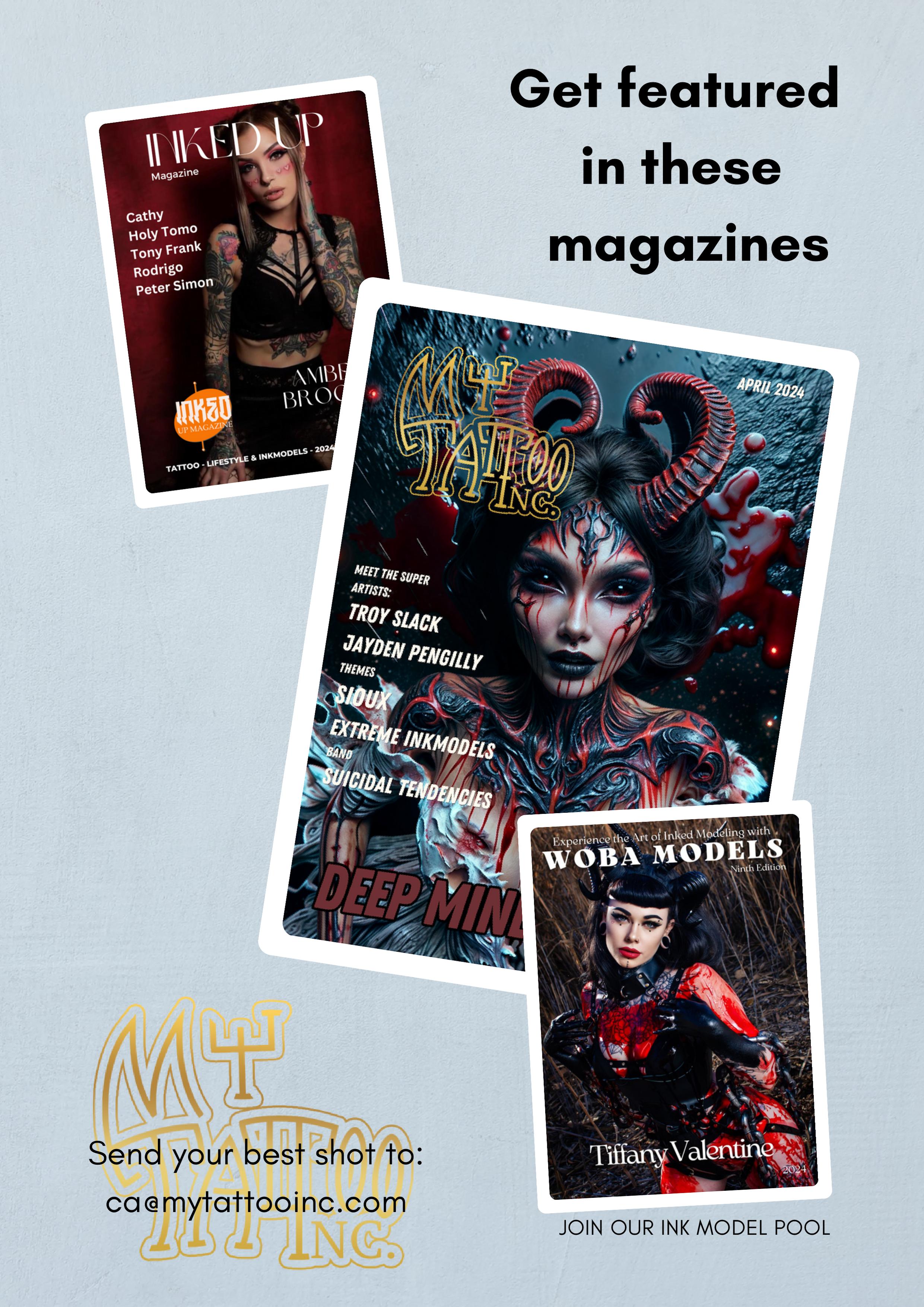 Step into the captivating world of Woba Models, where inked models transform into living works of art! We're delighted to present The Jaded Moon as our new front cover model. Thank you for embarking on this journey through the captivating realm of tattoo artistry with us. Allow yourself to be inspired by the incredible models featured in this issue, and look forward to even more stunning visual creations in our upcoming magazines. Stay tuned for a world where ink and creativity collide.