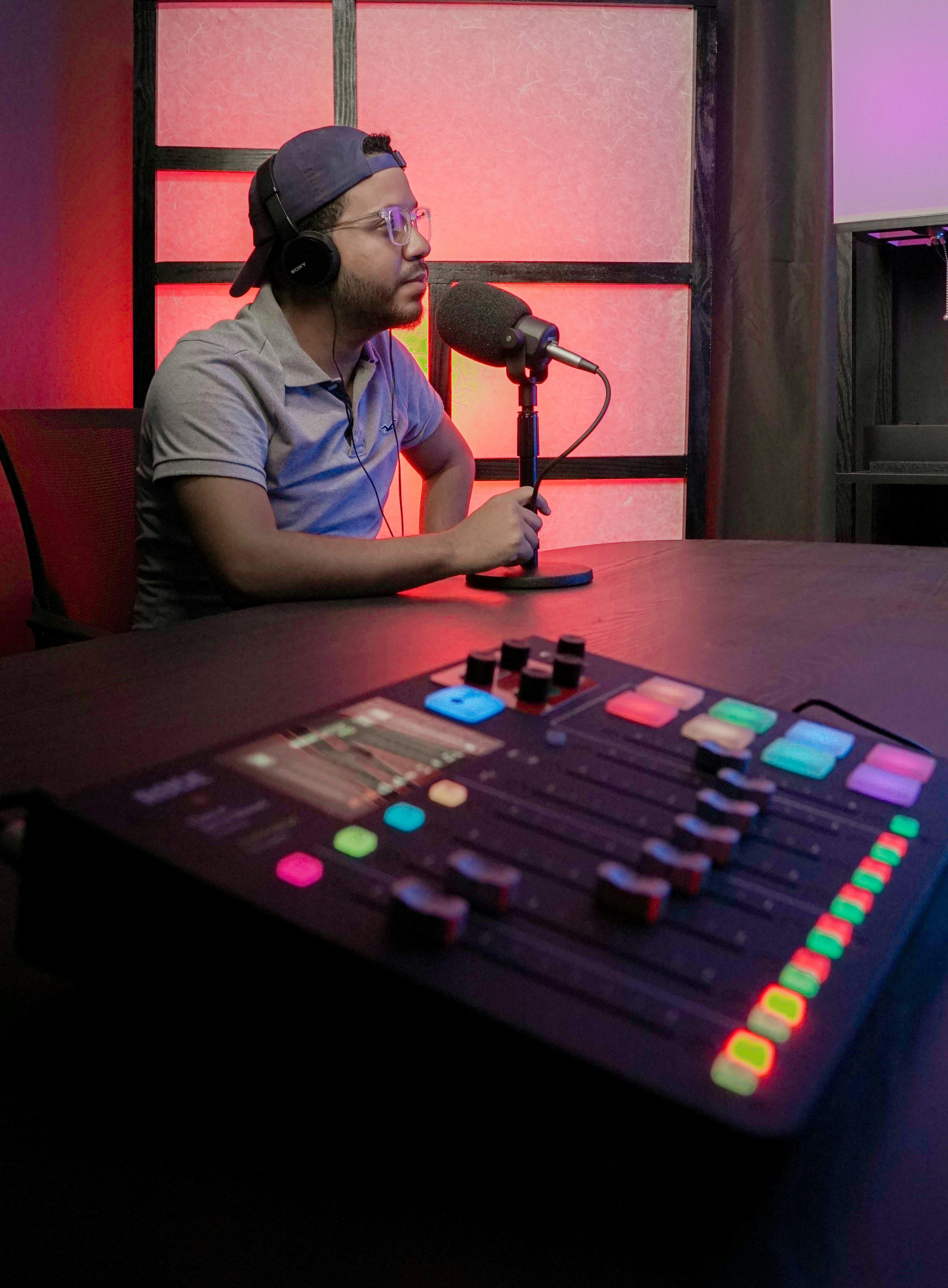 Bespoke audio capture furniture, acoustically treated space with lighting bar, camera and podcasting audio capture equipment. Ready To Engage? pay attention Stand tall and