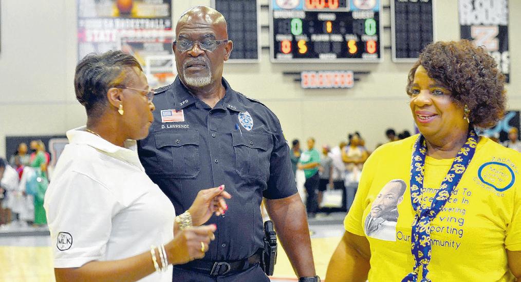 ZacharyPolice Chief Darryl Lawrence, center,provides support and staffduring the ZacharyMLK Committee Back-to-School Bash heldatZacharyHighSchool. Committee member Joann Sanders, left,and Committee Chairperson Johnnie Evans were busy assisting hundredsofstudents and parent participants.