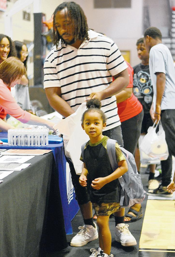 Queen Parker makes herway throughthe massivecrowd during the ZacharyMLK Committee Back-to-School Bash with thehelpofher father Quenton Parker.Queen will enter Pre-K this school year