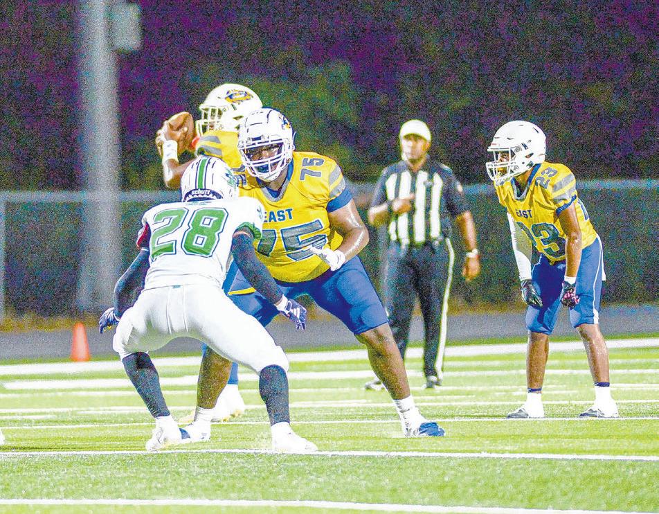 East Feliciana Tigers senior lineman Aumari Barnes drops back to protect his quarterbackand help the Tigers defeat the Mentorship Sharks 32-0inhome jamboree action.