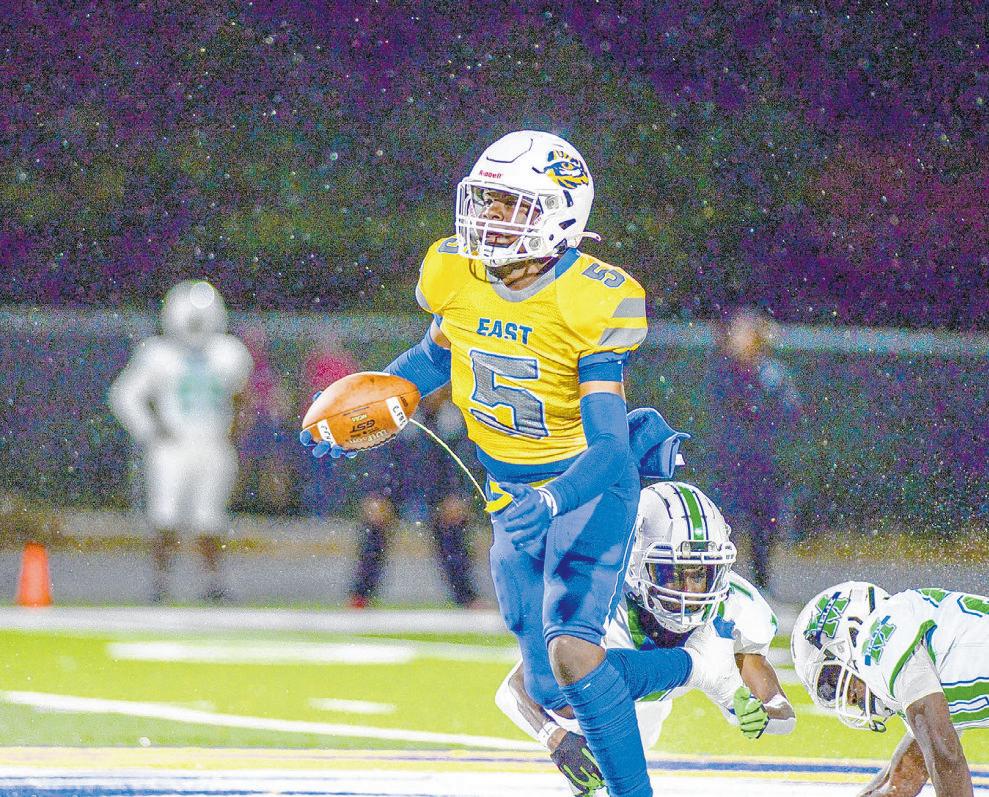 East Feliciana Tigers quarterback J’Maekus Cannon Jr.tucks the ball and movesup field forabig gain againt the Sharks defense.