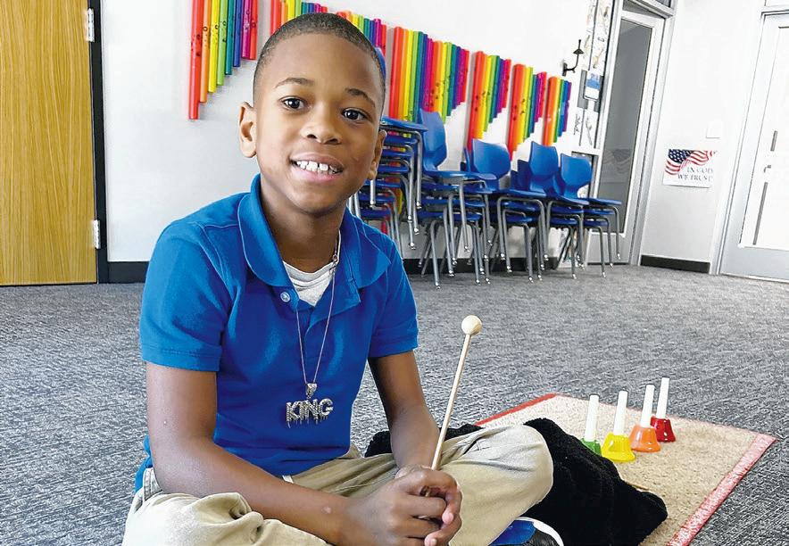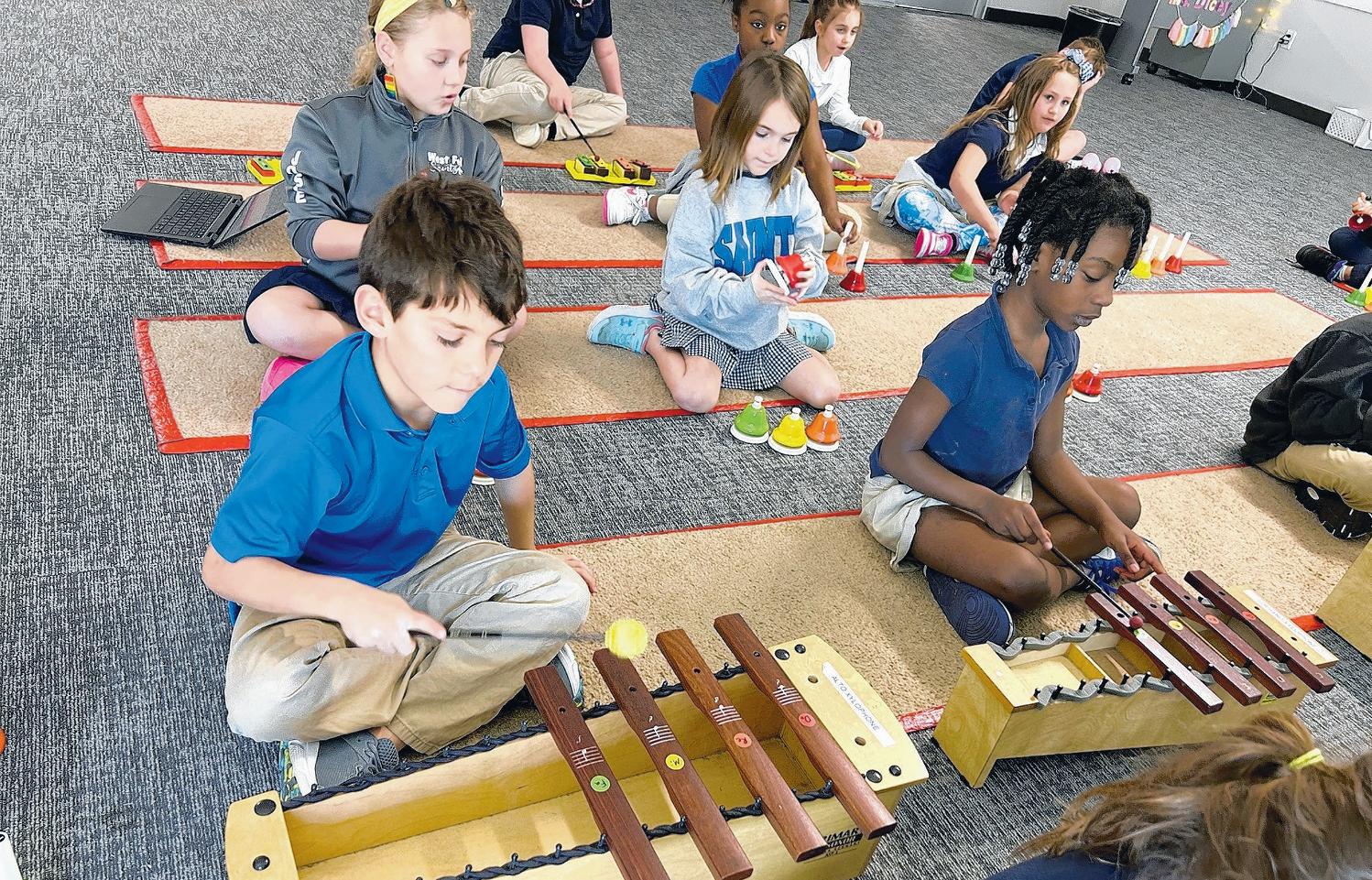 Bains Elementary second grade students Hank Morgan and Nyla Minor practice learning musical notes in Bryanna Dicey’s music class
