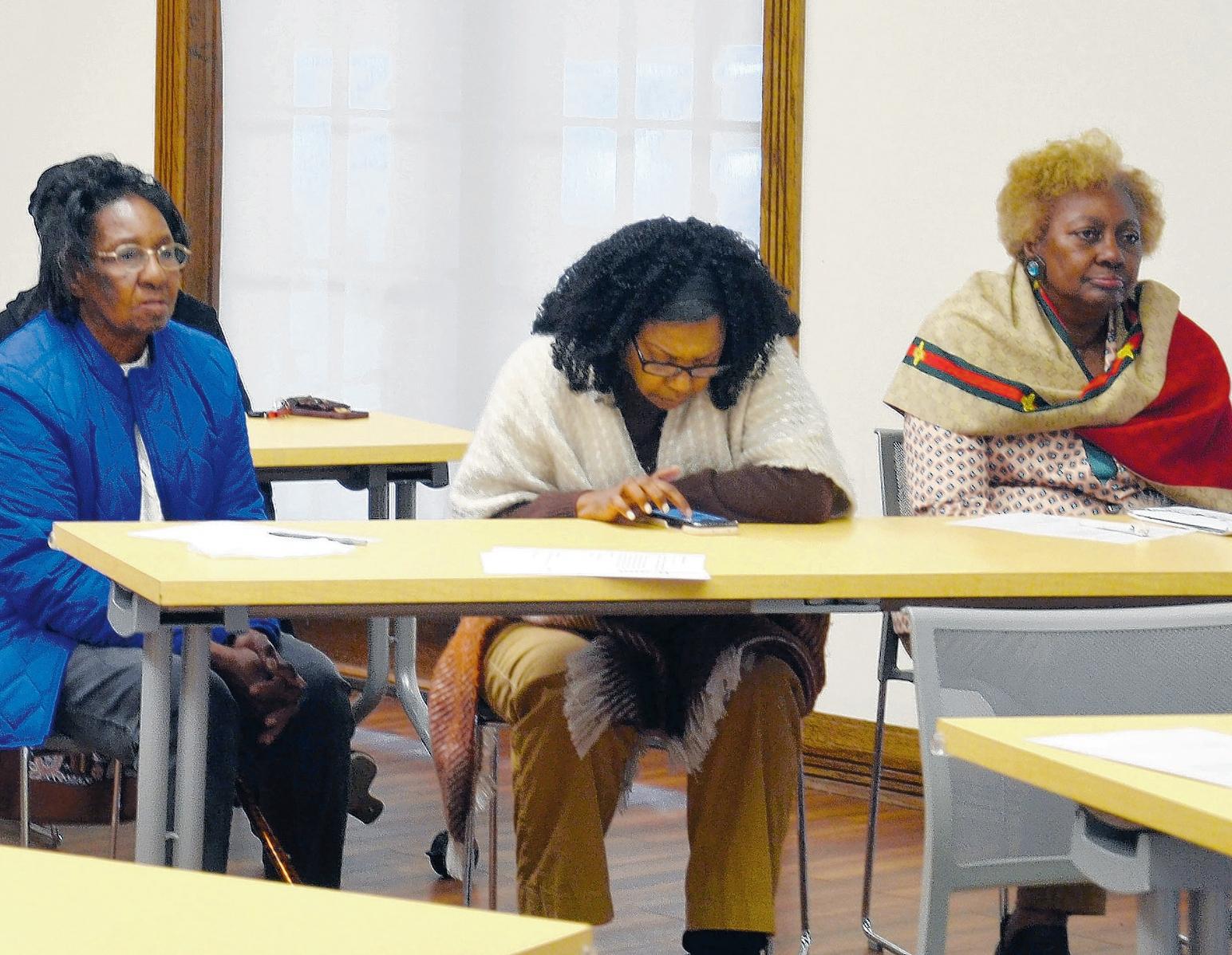 Three members of the West Feliciana community, from left, Clara Williams, Carmen Williams and Katherine Thompson, participate in a viewing of photos from the collection of renowned civil rights photographer Bob Adelman. The group helped identify local participants from a 1963 voter registration drive and even captured pictures from the session and texted them to others who couldn’t make the presentation.