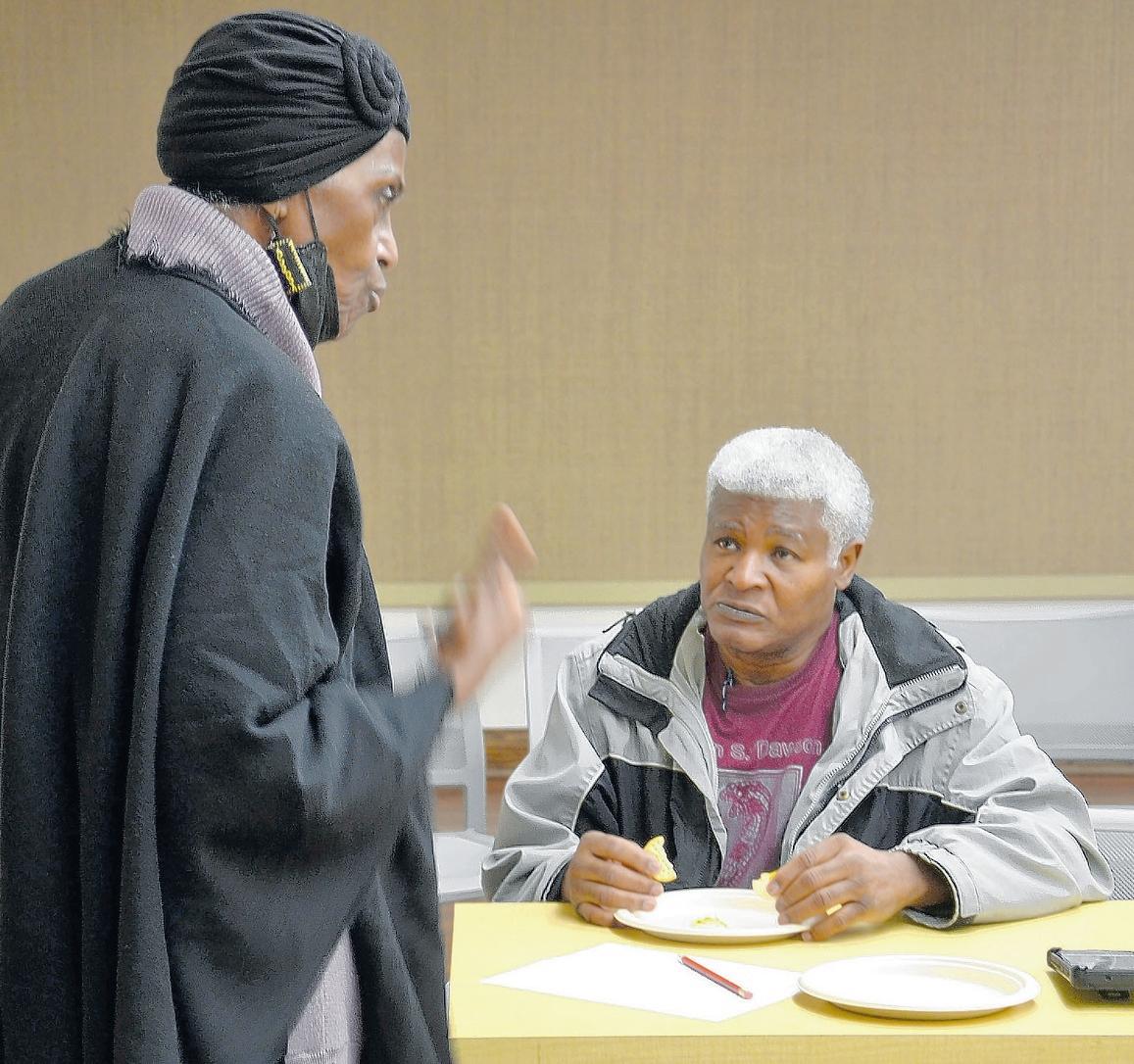 Sara Wilson Rogers and Calvin Miller Sr discuss historic moments in West Feliciana Parish after a view of photos by renowned civil rights photographer Bob Adelman.