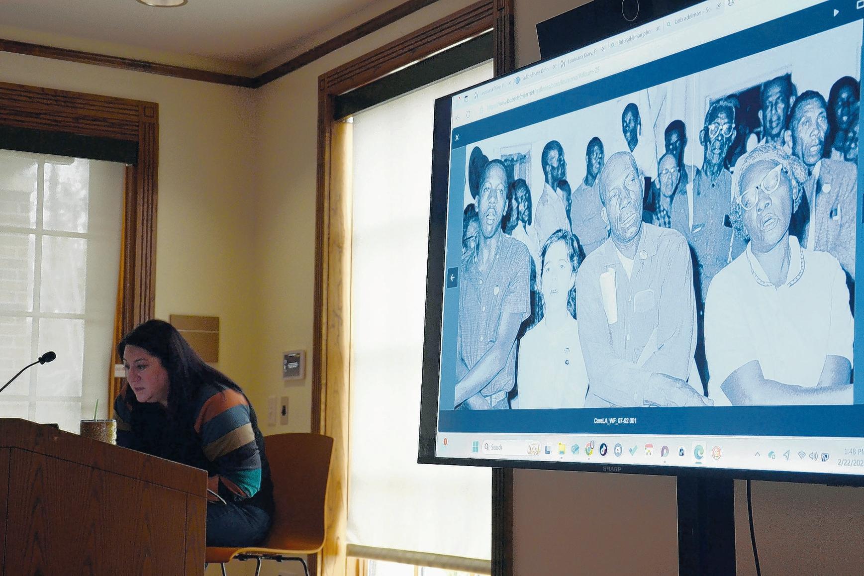 West Feliciana Parish Library Director Stacie Davis moderates a photo viewing and identification session Feb 22 from the Congress of Racial Equality image collection, showing residents at a local church service during a pivotal voter registration effort in 1963.