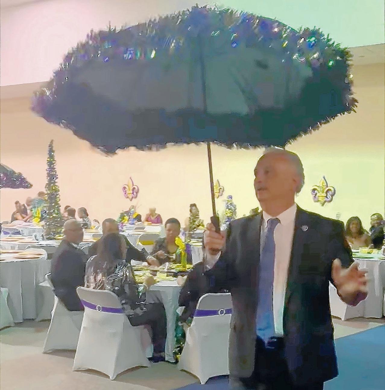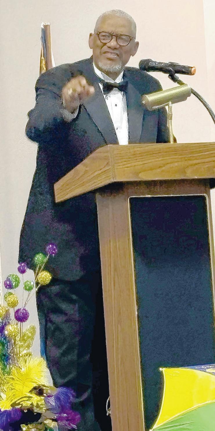 Former Clinton High band director Lawrence Jackson speaks to attendees at the East Feliciana Unified Alumni Association annual Mardi Gras Gala.