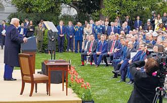 WASHINGTON President DonaldTrump on Wednesday announced far-reaching newtariffsonnearly allU.S.trading partners —a34% tax on importsfrom China and 20% on the EuropeanUnion, among others —that threaten todismantle much of thearchitecture of the global economy and trigger broader trade wars. Trump, in aRoseGarden announcement, said he was placing elevatedtariff rates on dozens of nations that run meaningful trade surpluses withthe United States, while imposing a10% baseline tax on imports from all countries in response to what he called an economic emergency
