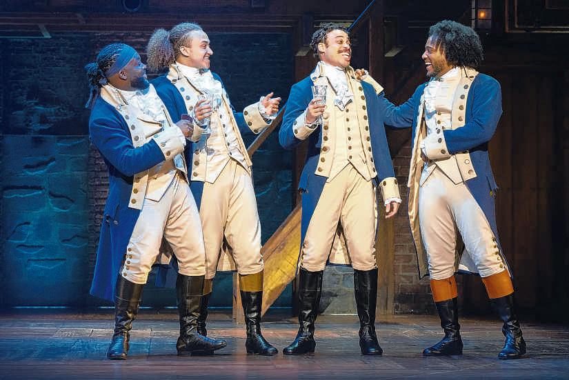 Elvie Ellis, from left, Nathan Haydel,Jared Howelton and Tyler Fauntleroy, whoplays the title role, are Revolutionarywarriors whoservedwith GeorgeWashington in ‘Hamilton,’opening Tuesdayatthe Saenger Theatre. Haydel is amember of the Chase culinary family of NewOrleans.