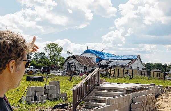PROVIDED PHOTO Mayor Jonas Anderson motions toward a storm-damaged home in Cave City Ark., following tornadoes earlier