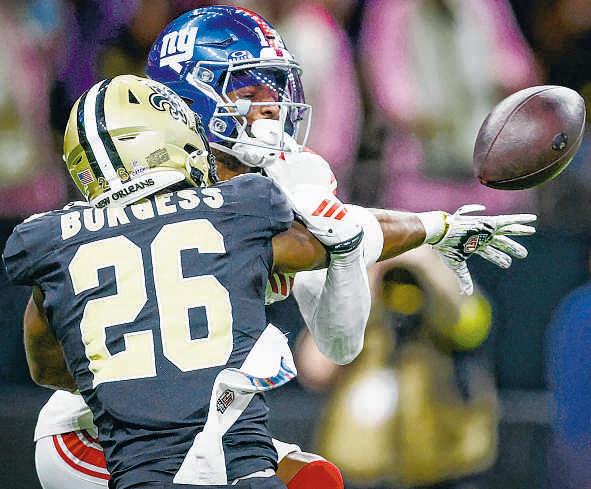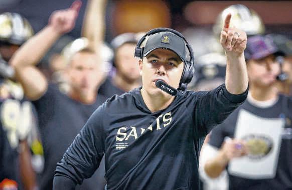Saints cornerback Kool-Aid McKinstry,center,celebrates with teammates afterhis secondinterception Sunday.Hewas responsible for two of New Orleans’five takeaways in a26-14 victory over the NewYork Giants. It was theSaints’ first victory since December and the first at the Superdome since November. It wasalso the first career win forhead coach Kellen Moore andquarterback Spencer Rattler, but it didn’t comeeasy. TheSaintstrailed 14-3 early beforeRattler hitRashid Shaheedfor an 87-yard touchdown, the team’slongest play from scrimmage since 2016. Later,Bryan Bresee forced aGiants fumble and Jordan Howden returned it 86 yards foratouchdown to pad thelead