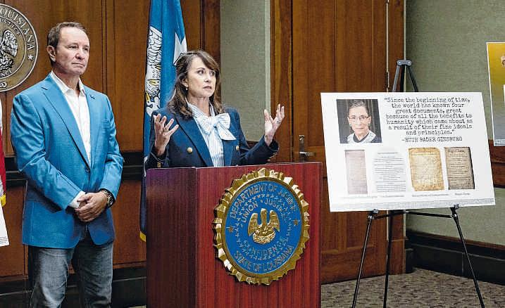 STAFF FILE PHOTO By HILARy SCHEINUK Attorney General Liz Murrill speaks alongside Gov. Jeff Landry during a news conference in 2024 regarding the Ten Commandments in