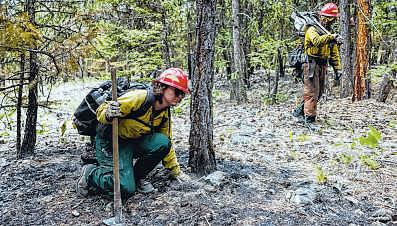 Grayback Forestry firefighters working on the Banana Lake Fire walk through the forest in a line and kneel down to feel for hotspots with their hands. Although the wildfire already burned through the area, small fires can burn underground or in tree root systems. Ground crews work in conjunction with drone pilots, who can detect hotspots using thermal imagery.