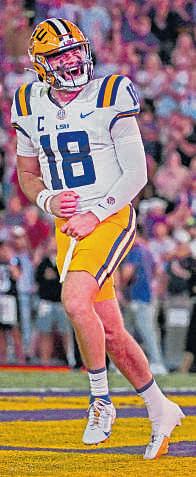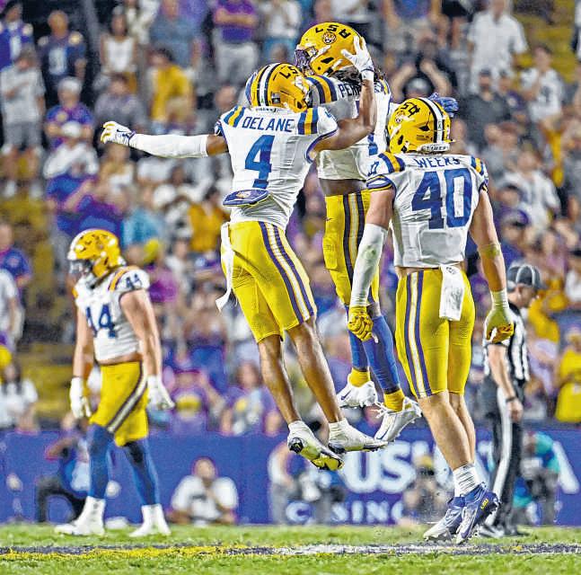 Sellers from thefirst snap of the nightuntil thelast, held theGamecocks to 317 yardsand forced apair of turnovers ABOVE: LSU cornerback MansoorDelane, fromleft, celebrates with linebackers Harold Perkins Jr.and Whit Weeks after holding SouthCarolinaonthe lineinthe secondhalf