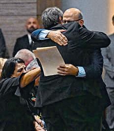 Iberville Parish Sheriff Brett Stassi, right, embraces a family member of fallen Iberville Parish sheriff’s Deputy Charles Riley during funeral services on Monday.