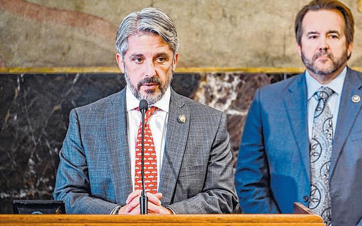 Senate President CameronHenry, R-Metairie, speaks during anewsconference alongside House Speaker Phillip DeVillier,R-Eunice, at theState CapitolonWednesdayafter the endofthe special session.