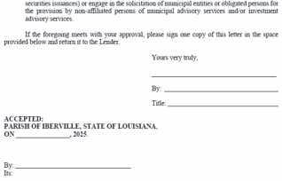 Term Sheet of the Purchasers for the Bonds, whichTerm Sheet is attached as Exhibit Ahereto, andany Executive Officer is hereby authorized and directed to execute the Term Sheet on behalf of the Parish As acondition to the delivery of the Bonds to the Purchasers, each Purchaser will execute astandard letter, acceptabletoitand the Parish,indicating it has conductedits own analysis with respect to the Bonds andisextending creditinthe formofthe Bonds as avehicle for making acommercialloan to the Parish The foregoing ordinancewhichwas previously introduced at the meeting of the Iberville Parish Council on September23, 2025 anda copy thereof having been published in the official journalonSeptember 29, 2025 the public hearing on this ordinanceheldonthe 21st day of October, 2025, at 6:00 p.m., in the Council Meeting Room, 58050 Meriam Street Plaquemine, Louisiana,was brought up for finalpassage with amotion by CouncilwomanJenkins andseconded by CouncilmanBradford, having been duly submitted to avote,the ordinancewas duly adopted by the following yea andnay vote on roll call: YEAS: Allen, Easley,Dominique, Frazier,Pierce, Jenkins, Bradford, Martinez, Dardenne, Jewell.
