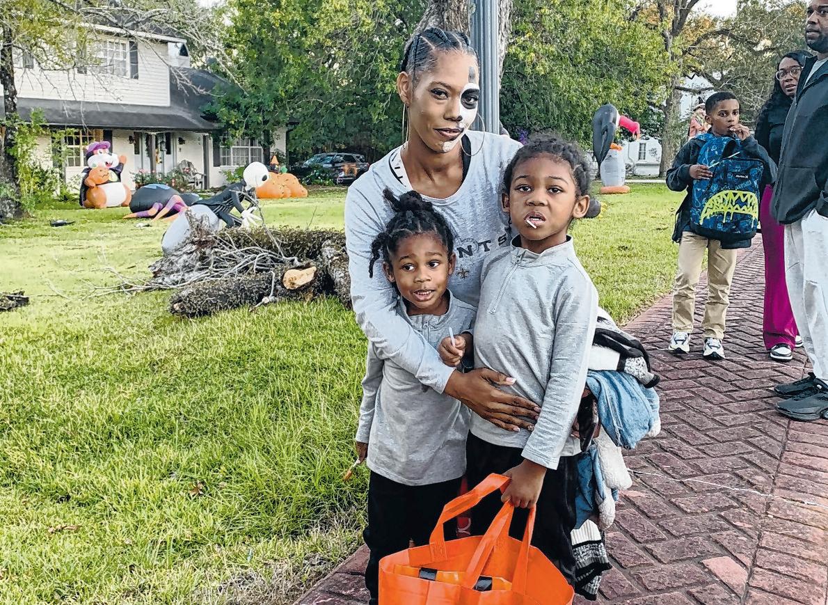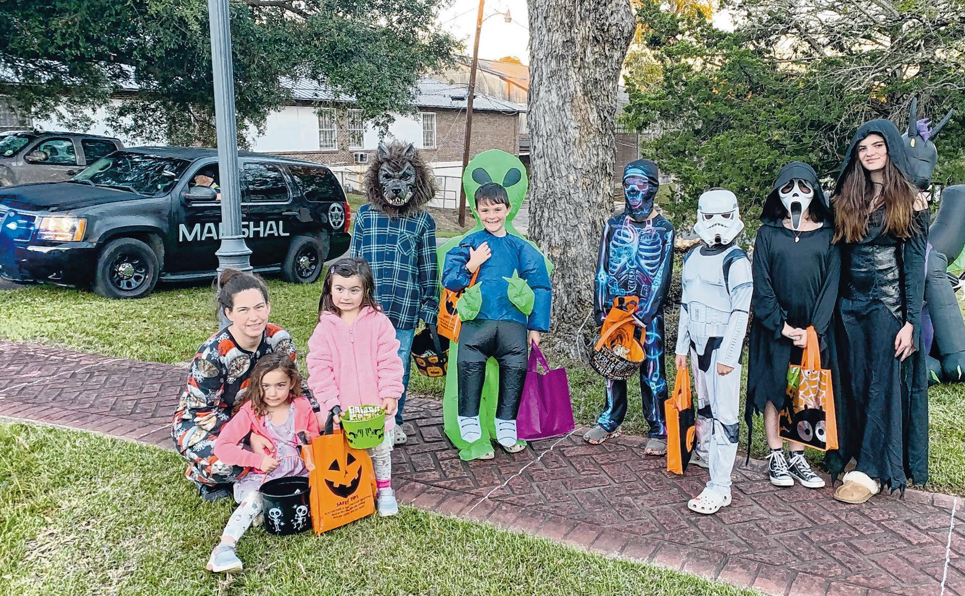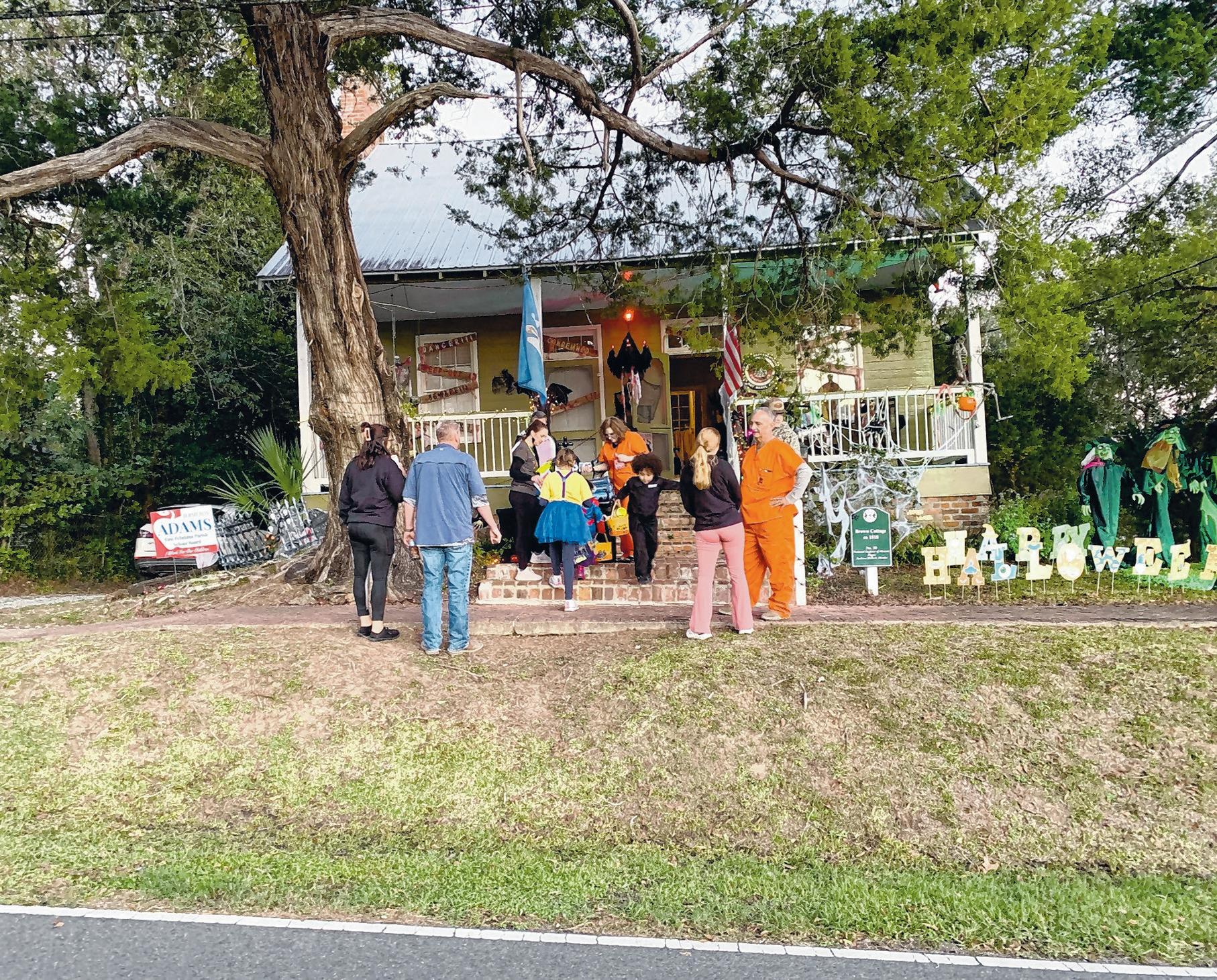 PHOTSO BY MELINDA RAWLS HOWELL The starting point for many at Spooktacular was at the corner of Charter and College streets. Rep. Roy Daryl Adams is on the right dressed in orange. His wife, Tonya, on the steps of his office giving out treats, also sports orange. Tthe matching outfits say Adams Asylum Inmate on them.