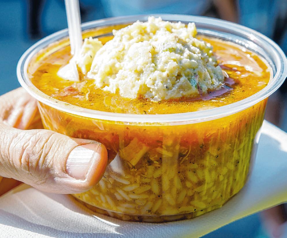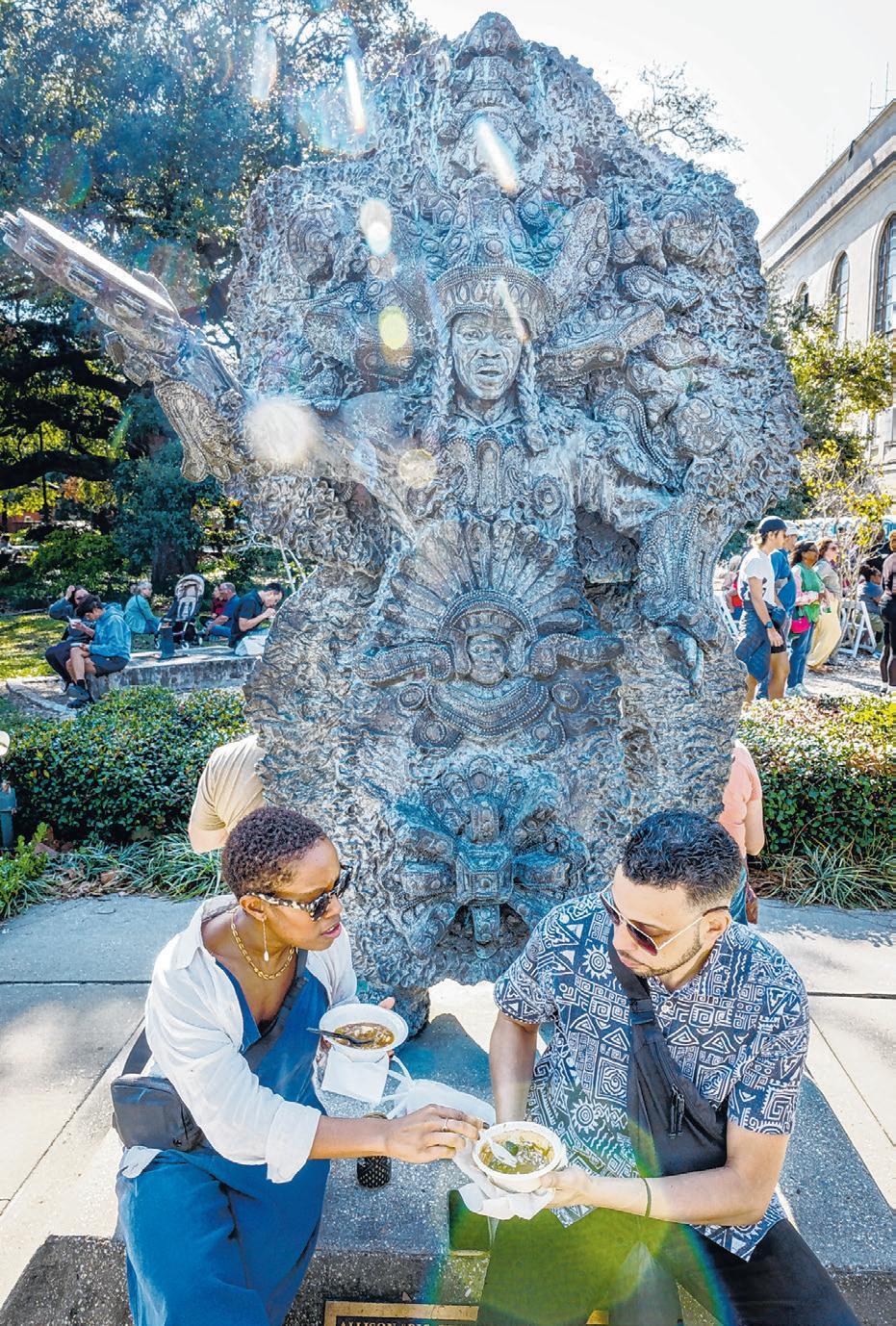 Even after numerous flight delays due to the government shutdown, Tanya Birl-Torres, left, and her husband, Wilson Torres, both of New York, managed to get to New Orleans in time for the fest. The two share bowls of gumbo as they sit in front of a statue of Allison ‘Big Chief Tootie’ Montana by artist Sheleen JonesAdenle.