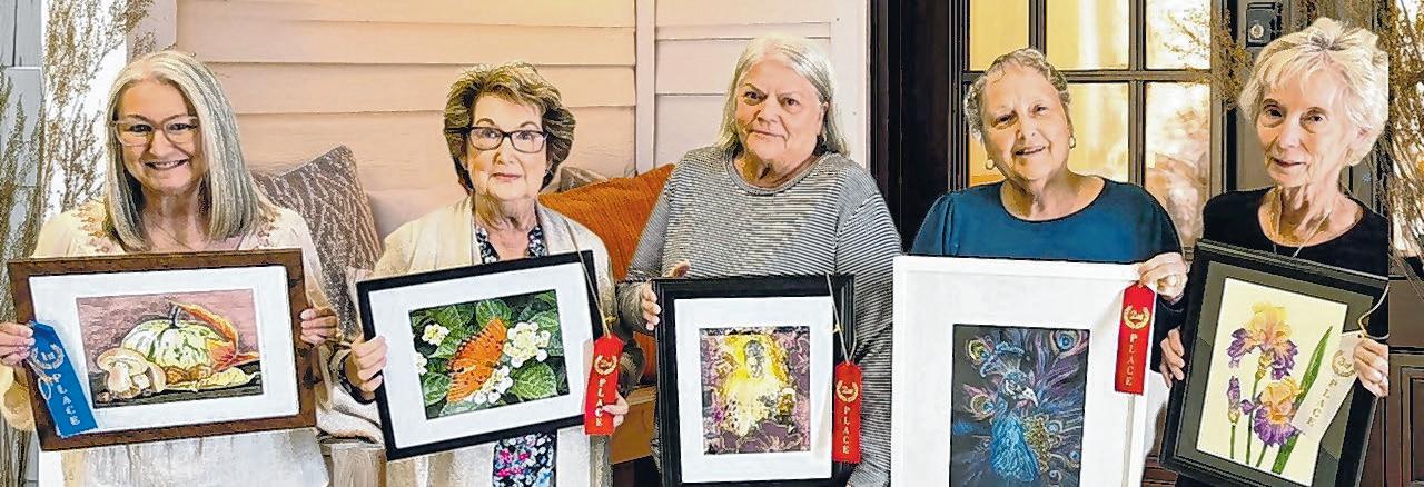 had named its Artists of the Month for November. Pictured from left are Ann Clement, watercolor, ‘Fall Still Life,’ first place; Alice Gore, photo, ‘Wounded Beauty,’ second place; Deb Carrao, mixed media, ‘Shadow,’ second place; Carolyn Clausing, pencil colors, ‘No You May Not Have a Feather,’ second place; and Gerry Gieseler, watercolor, ‘Oroses,’ third place. All artwork can be viewed at the St. Charles Parish East Regional Library, 160 W Campus Drive in Destrehan, through November.