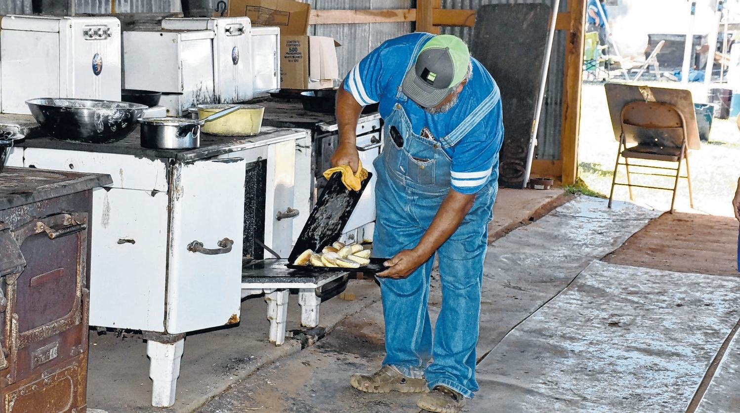 Lamar Glaze takes out a hot batch of homemade biscuits baked on
