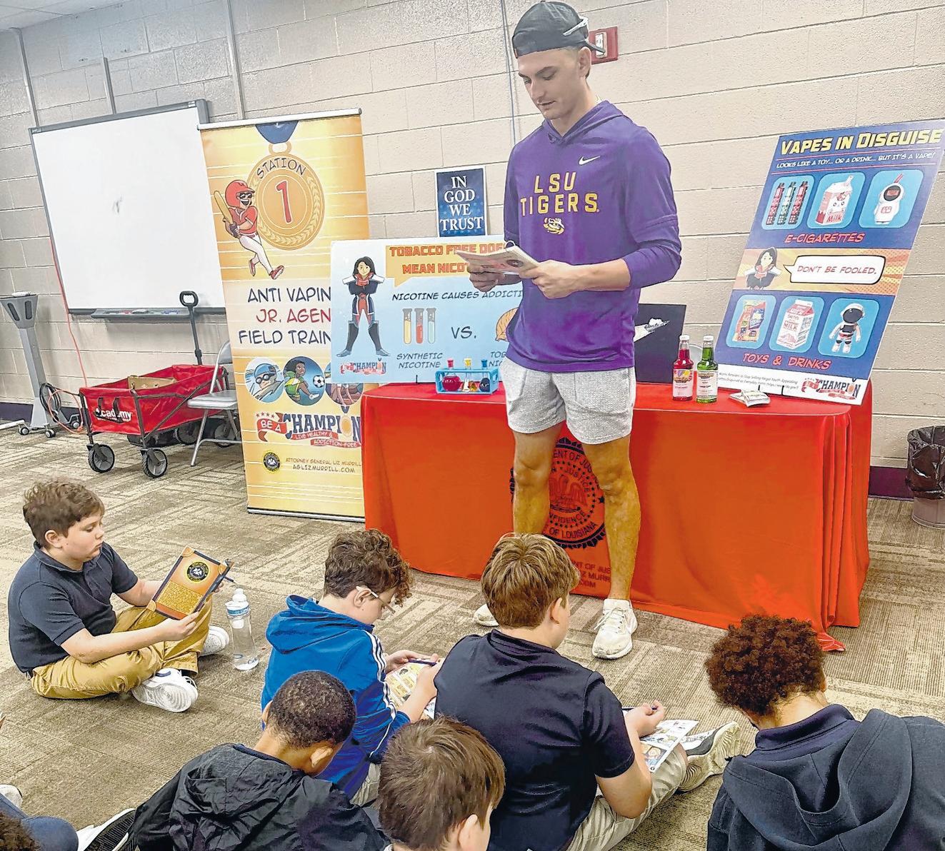LSU baseball player Eddie Yamin shares information about the advertising strategies of vaping companies to target youth with sixth graders at Denham Springs Junior High School during a recent anti-vaping outreach presentation.