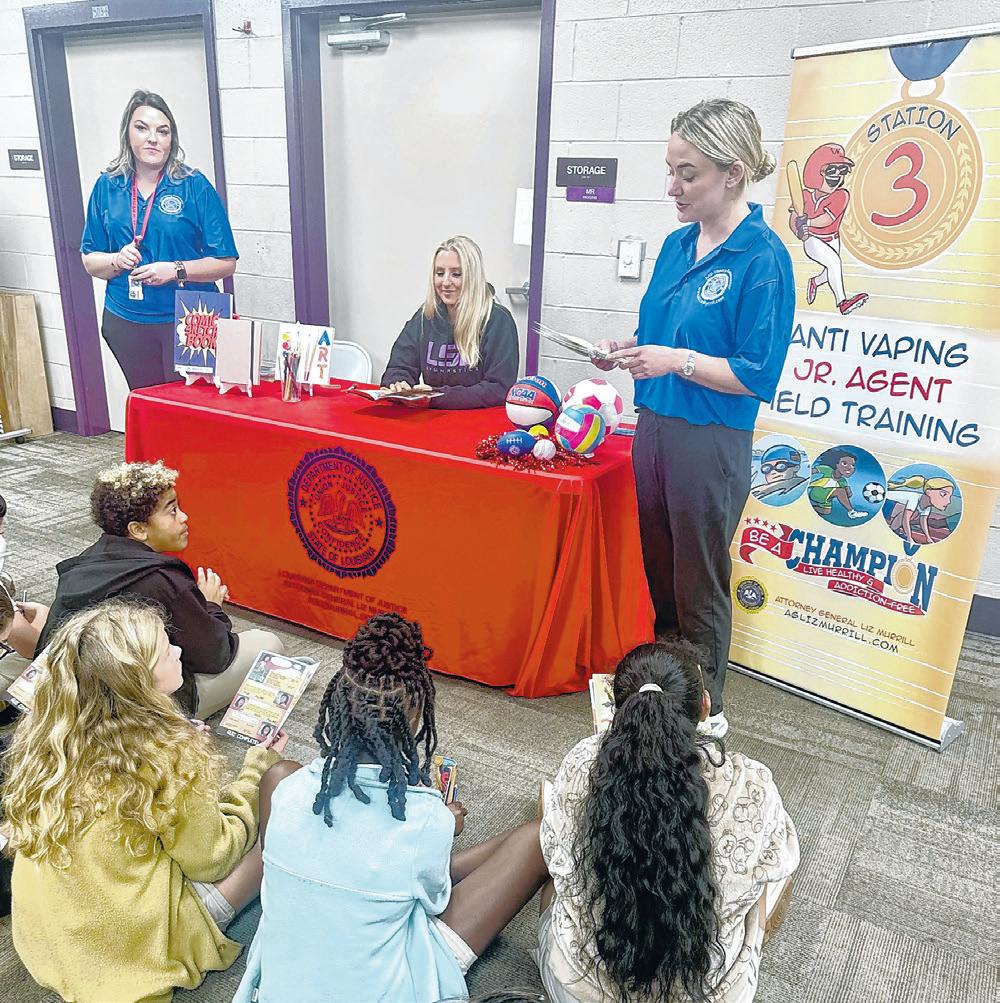 Two LSU student-athletes recently joined members of the Louisiana Attorney General’s Office to point out the dangers of vaping to sixth graders at Denham Springs Junior High.