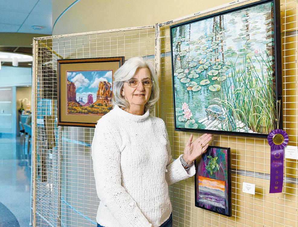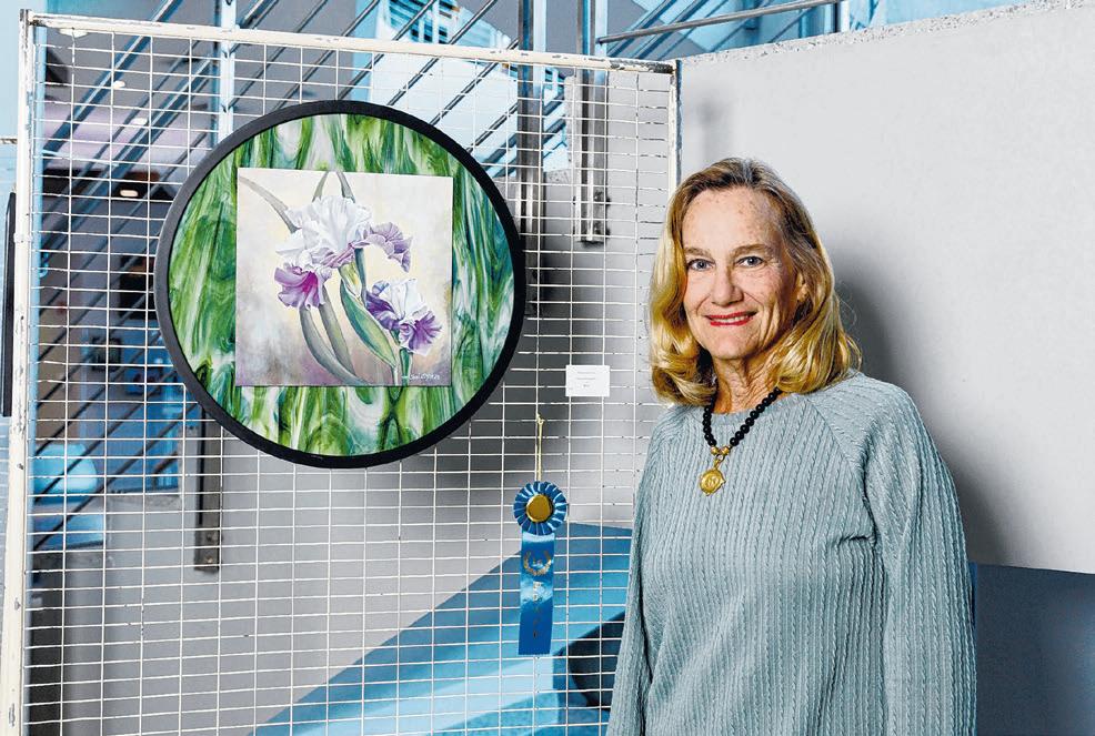 Mary Christopher, a 20-year-member of the Slidell Art League, credits the group with giving her just what she needed to help her succeed — including competition. Here she stands by her winning piece, “Frannie’s Iris,” where it hangs as part of a current league exhibition in the corridors of Slidell Memorial Hospital.