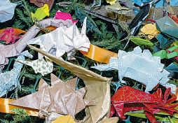 The new origamipieces are bolstered by archived worksstored from priorseasons, including a40-year-old model of apterosaur,anextinct flying reptile,thatwas folded for one of the museum’s first origamitrees in theearly 1970s.