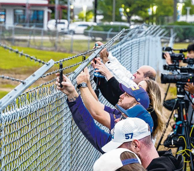 When the private plane carrying Lane Kiffin landedSundaynight, it pulled into ahangar outofsight from asmall crowd of fanswho had gathered in the misty cold. They peered througha chain-link fence, trying to see the new LSU head coach. Kiffin was greeted insideby school officials, then he got into a car along with his familyand the coaches he brought with him from Ole Miss.