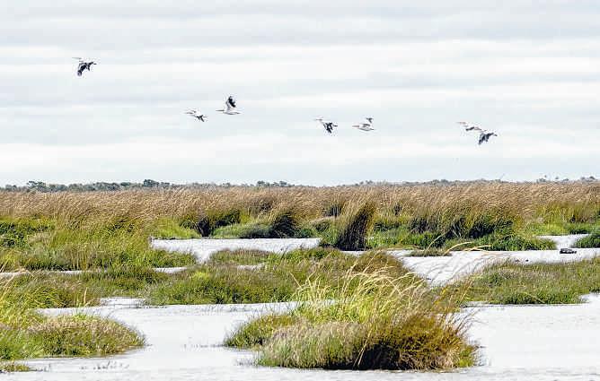 Birds take flight over amarsh-creation area of theLakeBorgne Marsh CreationProject in St. BernardParish on Tuesday