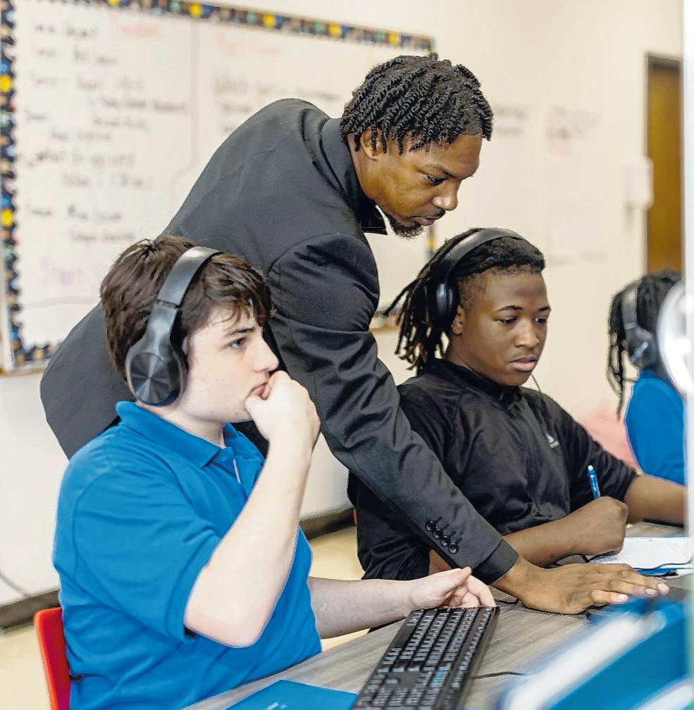 Eighth grade science teacher Tredarius Carr assists Austin White and I’Darius Collins at the new Star Academy
