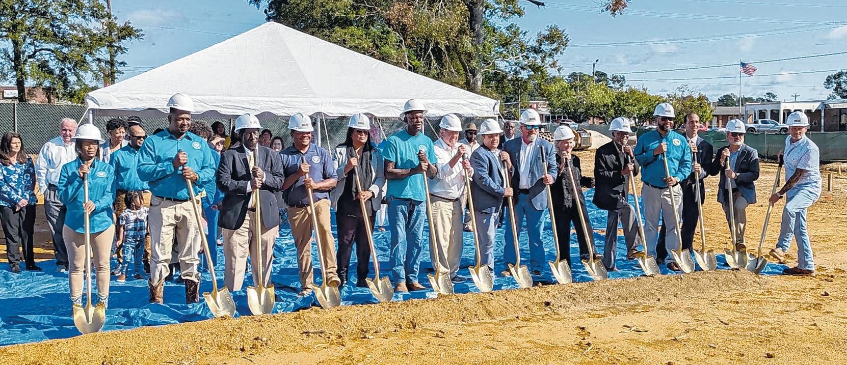 Members of the St. Helena Parish Police Jury, officials, community members, the library director and board the St. Helena Parish sheriff, the architect from Holly & Smith and the owner of Brunt Construction take part in a ceremony Oct. 27 Audubon Regional Library to break ground on the new St. Helena Branch library location in Greensburg