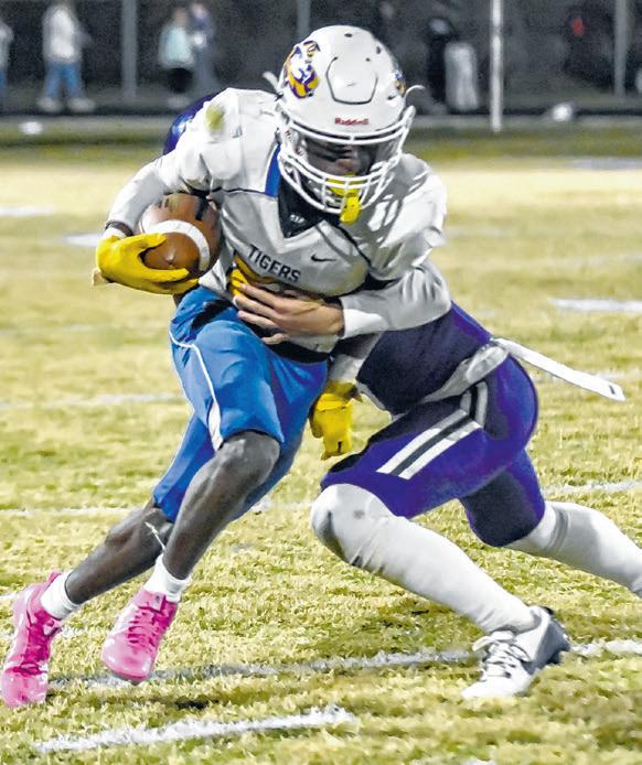 PHOTO BY DAVID THOMAS JR. Ryan ‘Bug’ Moore attempts to break a tackle of a Mangham Dragon defender