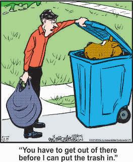 DearHeloise: Ikeep asmall pail with awell-fitting lid at my house and place atrash bag liner into the pail. When walking the dog, Iuse doggy bags to pick up the poop, carry it home, and put it into the pail. When the weekly garbage collection is due, Itie aknot in the liner and place it in the trash. It’s best to keep the pail ashort distance from your door and in the shade. Rinse it out weekly and let it air-dry.Problem solved! —C Bram, via email
