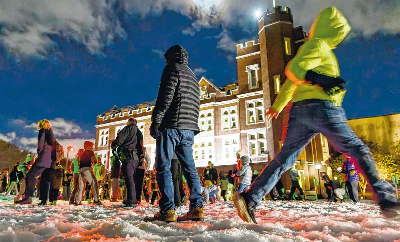 More than 20 tons of faux snow were dumped on the lawn outside Loyola University’s Marquette Hall and Horseshoe, offering students, faculty, alums and the community a chance to get a taste of the winter white stuff. Design students created animated projections to adorn Marquette Hall and St. Ignatius Chapel. Santa and Mrs. Claus made an appearance, along with treats and live music.