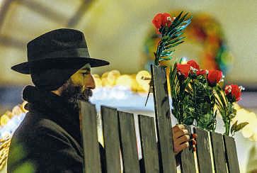 ABOVELEFT: Aman pins arose to asmall cardboard menorah in commemoration of survivors of antisemitism.
