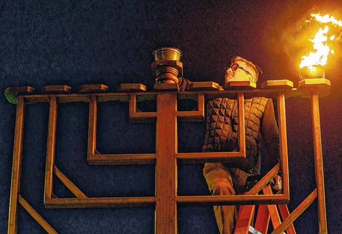 ABOVE: Aman lights acandle on themenorah on Sunday duringthe MenorahLighting ceremony at SpanishPlazainNew Orleans. TheHanukkah menorahsignifies themiracle of oil that burned for eight days and is lit each night for eight nights